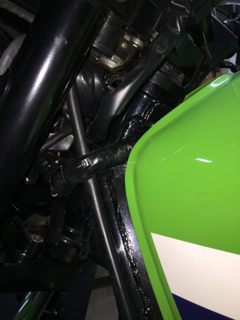 新品交換済みというメインハーネスは、タンクのエッジと擦れて被覆にキズが。