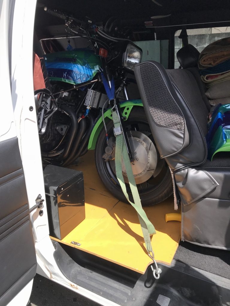 トランポの天井が低いので、フロントカウルとミラーは外して積み込みます。