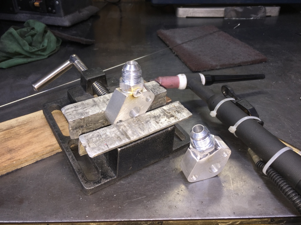 フレーム側を冷ましている間に、オイルクーラー取出しブロックを溶接で組み立てます。