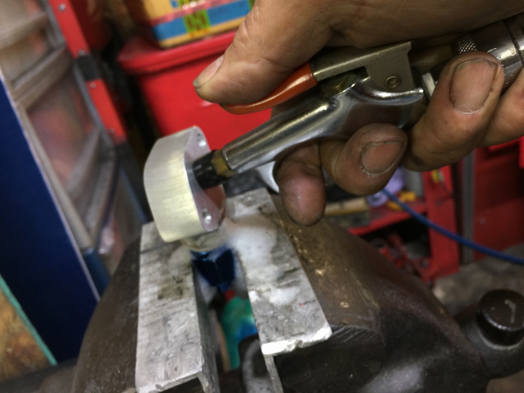 オイルブロックが冷めたら、エア圧で溶接部分の漏れチェックをします。