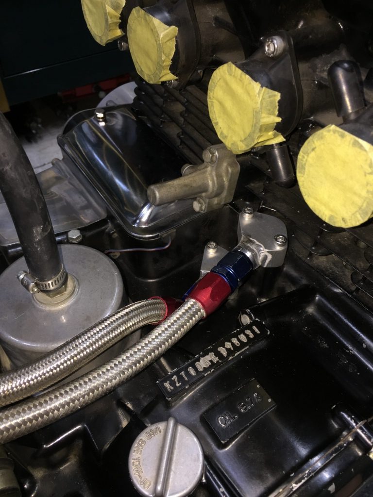 オイルブロックをエンジンに仮付けします。ダミーホースを取り付けて、ホースレイアウトを確認します。
