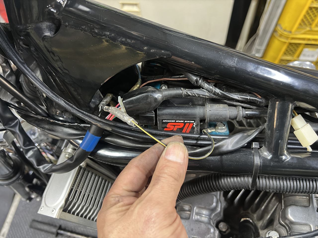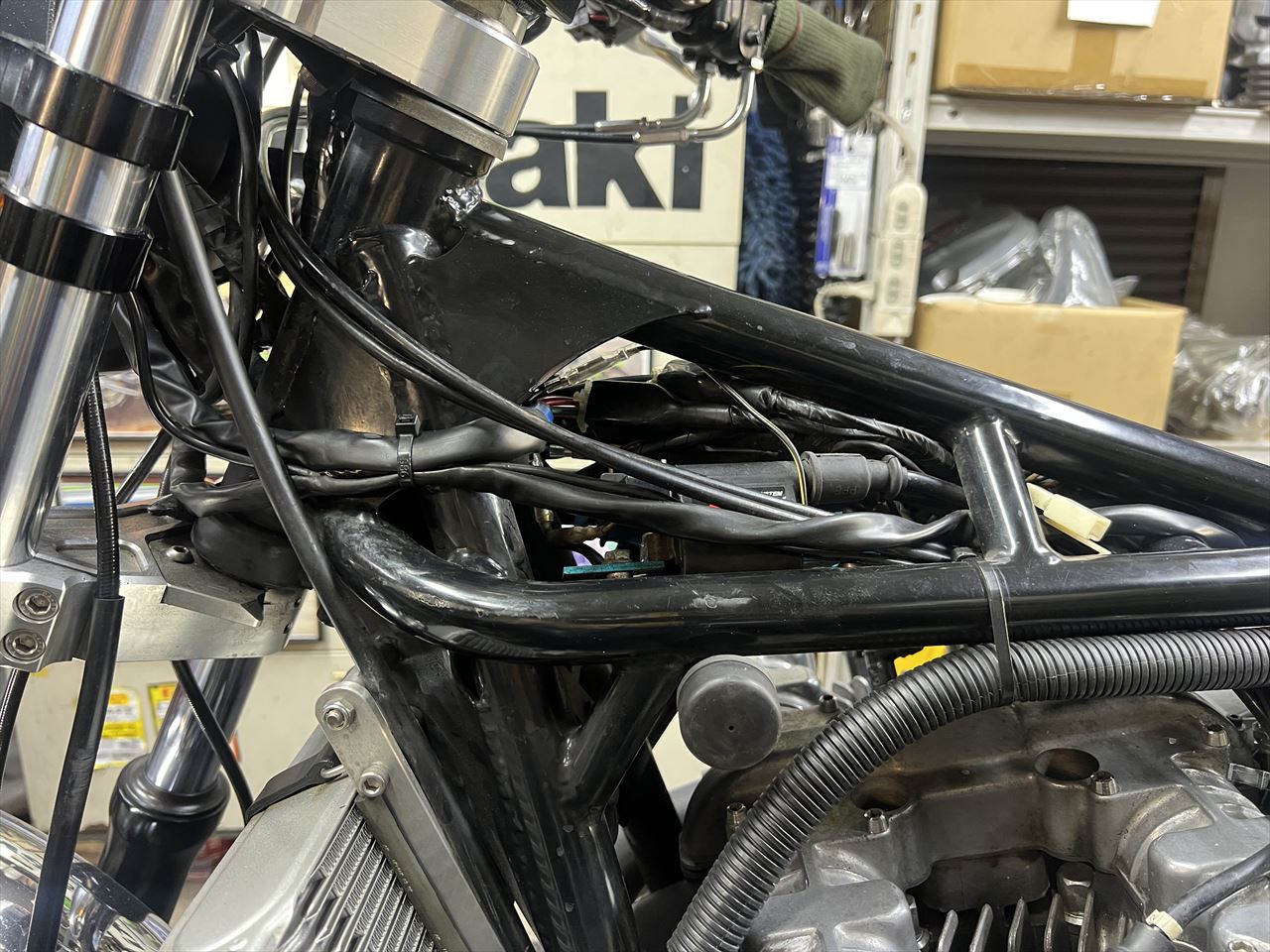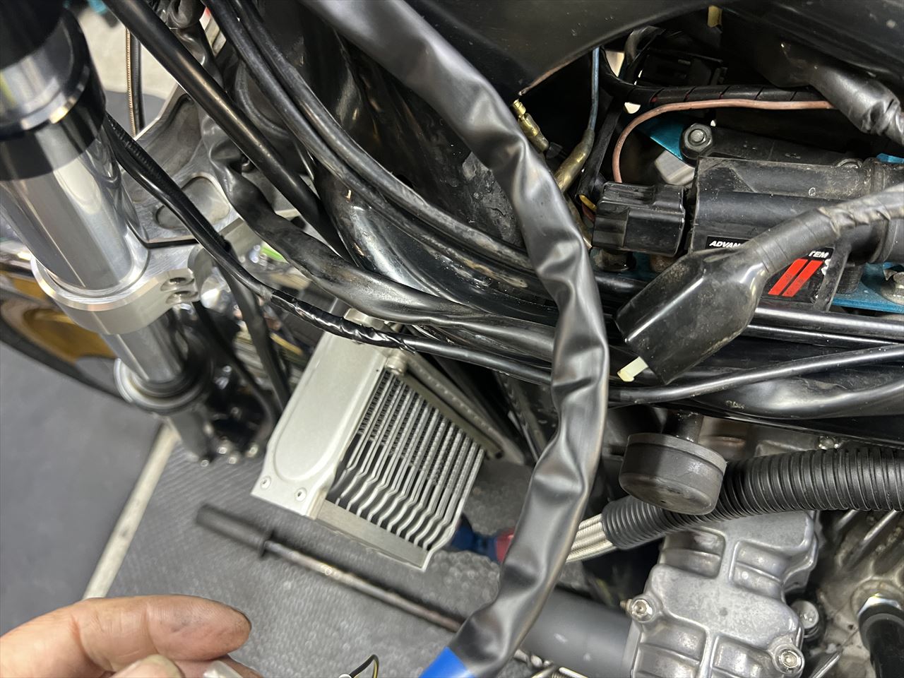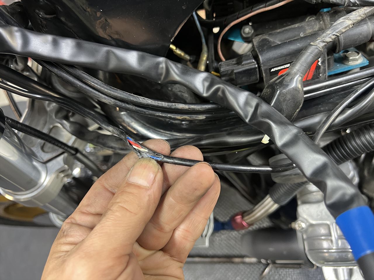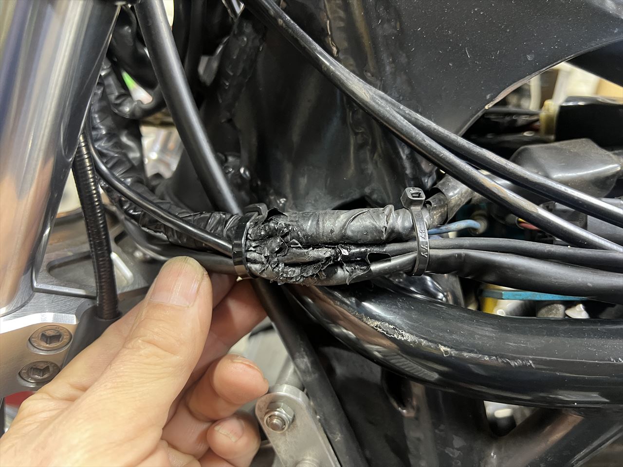 フレーム左前のハーネスが、タンクと干渉して被覆が切れてきています。これも修理しましょう。