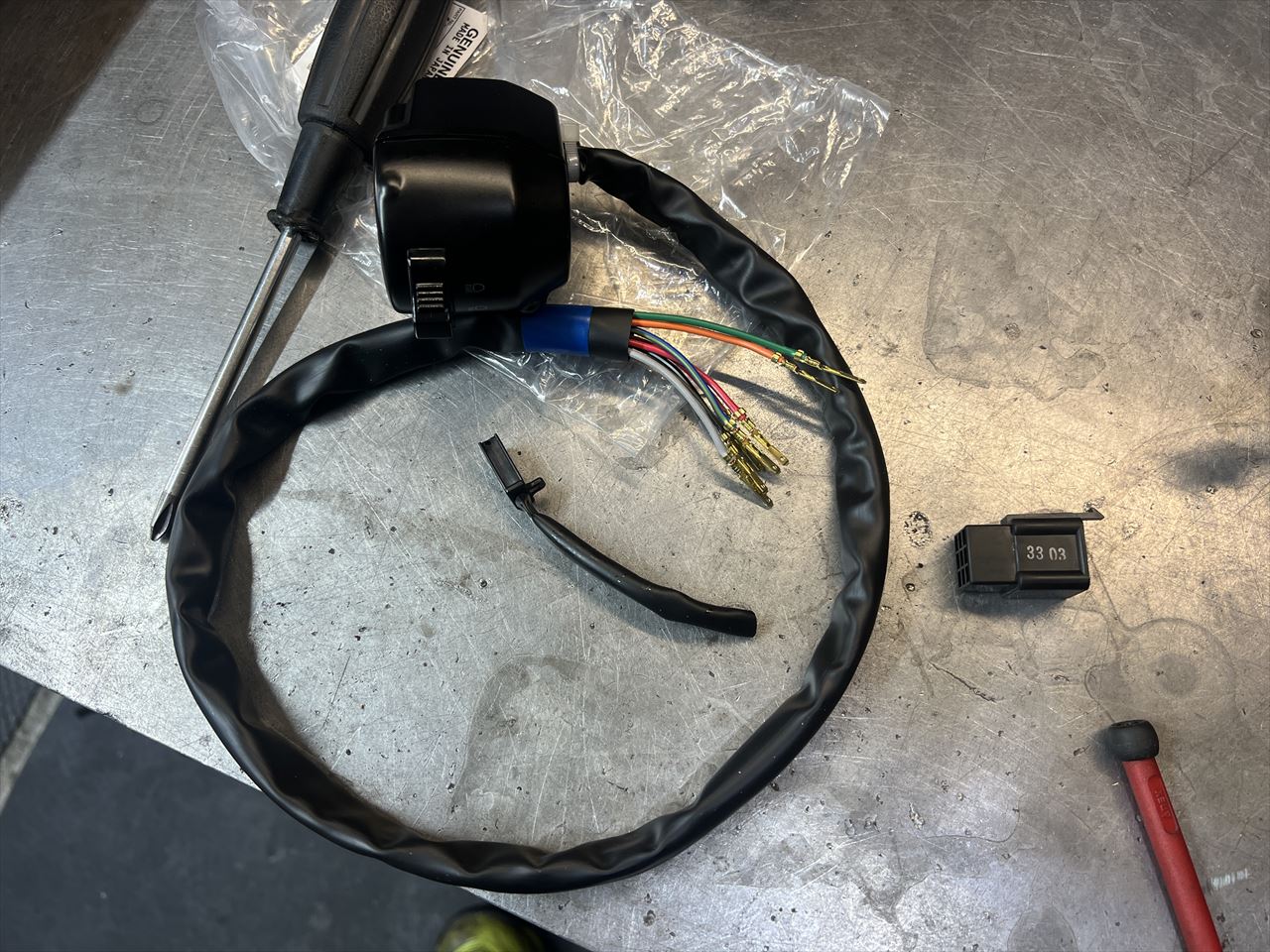 先ほどのハーネス損傷個所を点検します。幸い内部の線はダメージを受けていないようです。