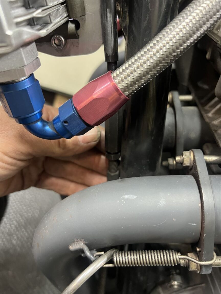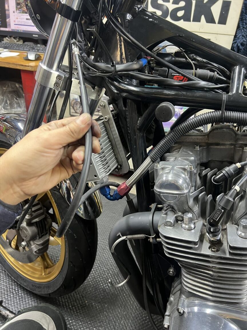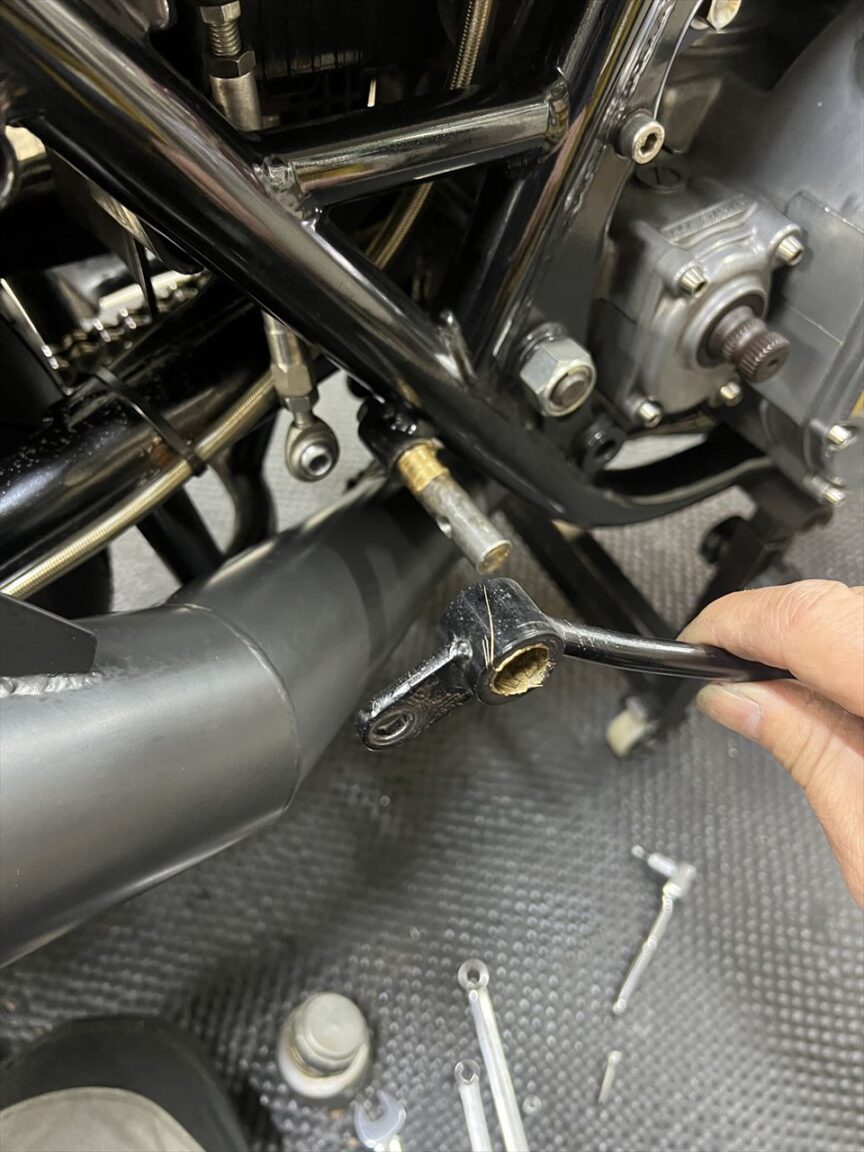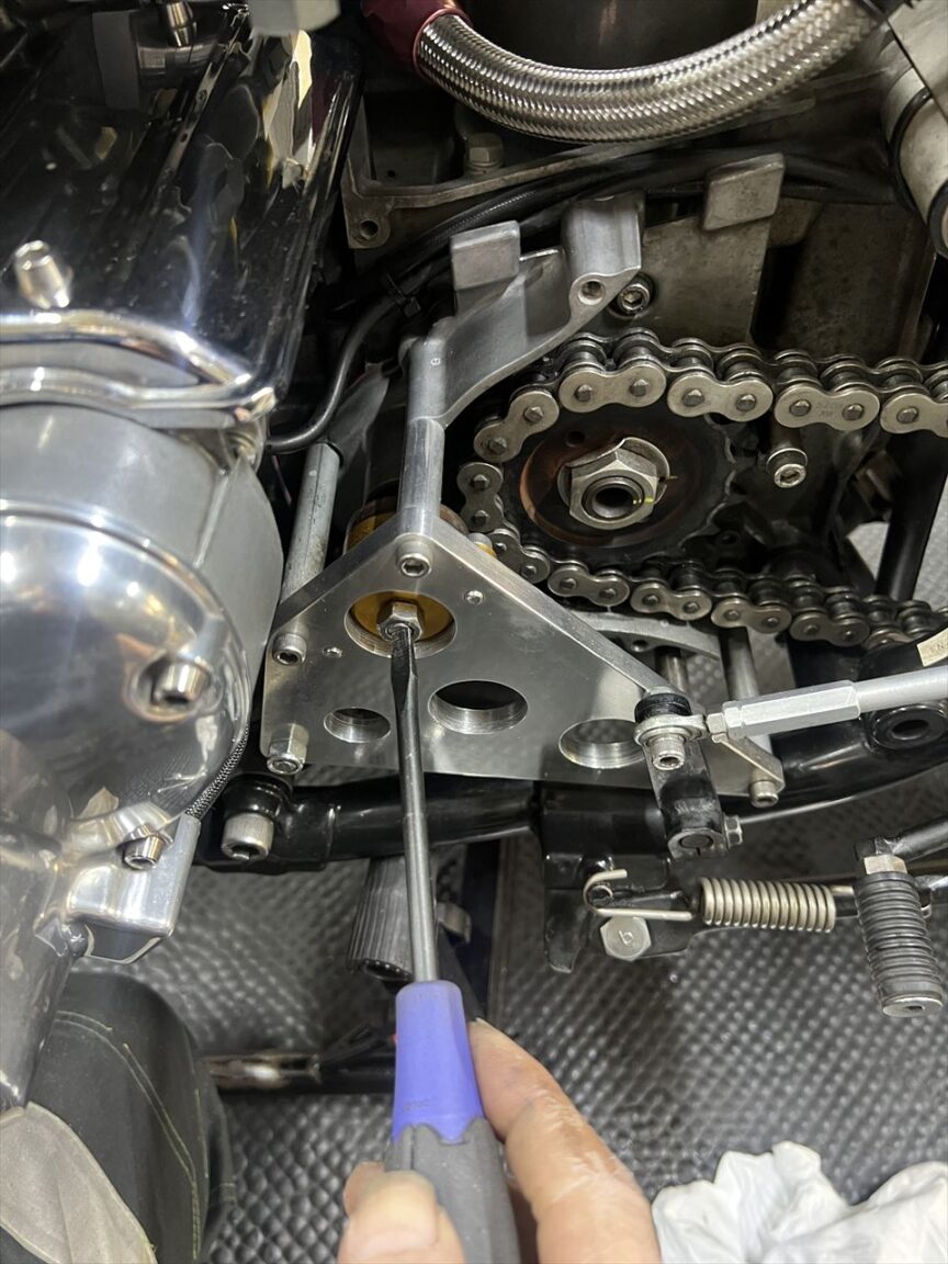 クラッチレリーズの遊びも調整します。距離を走っているので遊びゼロでした。ここはクラッチ板の摩耗により遊びが減少し、遊びゼロになるとクラッチ滑りの原因となるので、定期的に調整が必要です。この車両はPMC製のイージークラッチキットにあるレリーズベアリングを使っているため、調整方法はZ1000Rと同じ方法となります。ノーマルZ1などとは回転方向が逆になるのご注意を。