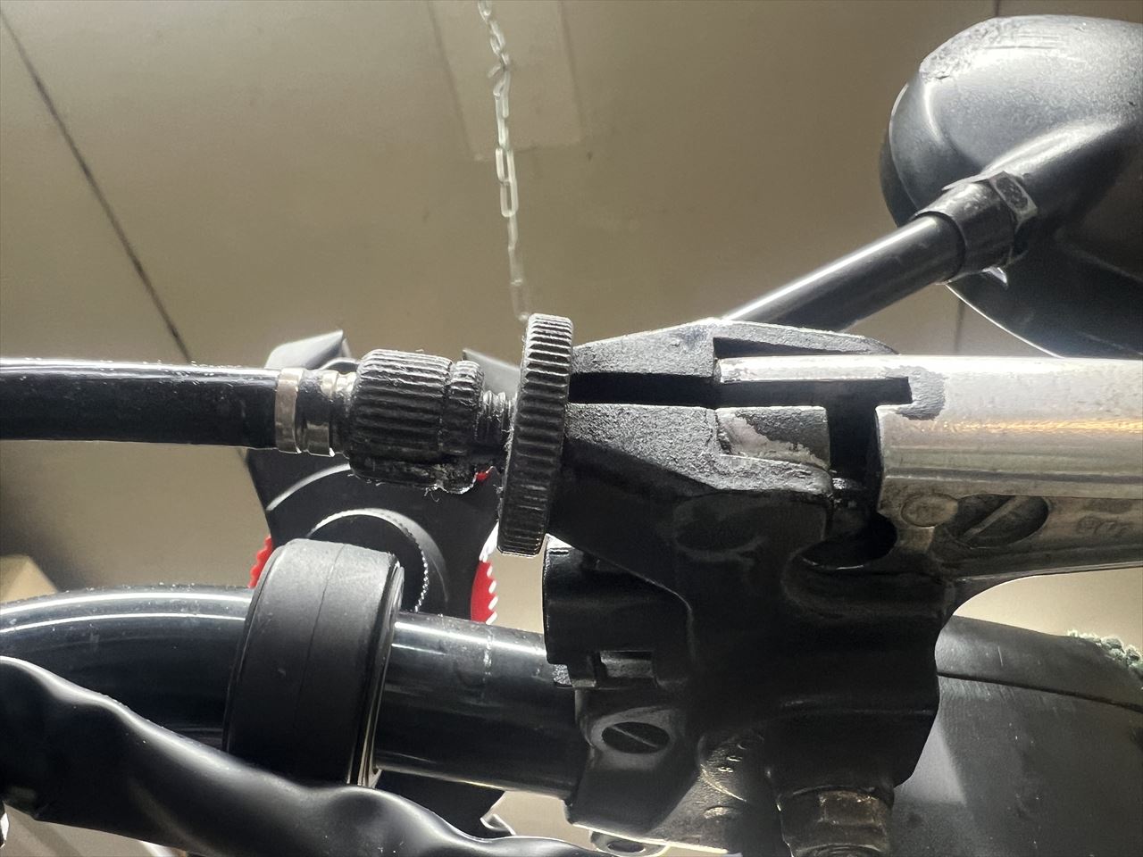ハーネス損傷部位、クラッチケーブルの取り回しを変えて修正することに。