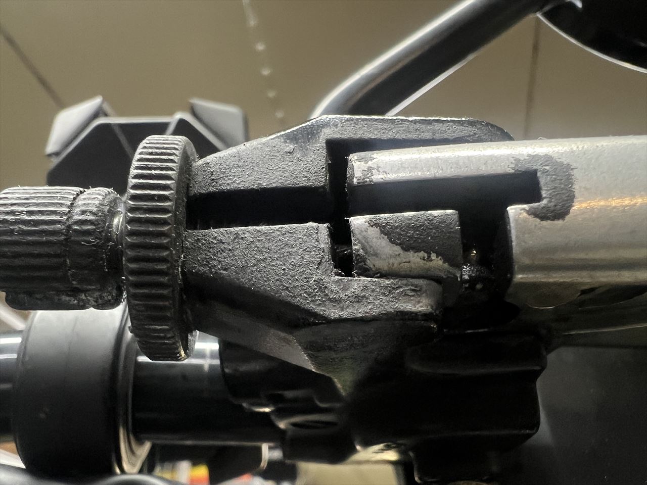 レバーの遊びは中間アジャスターで調整します。レバー部のアジャスターはその後の微調整用です。