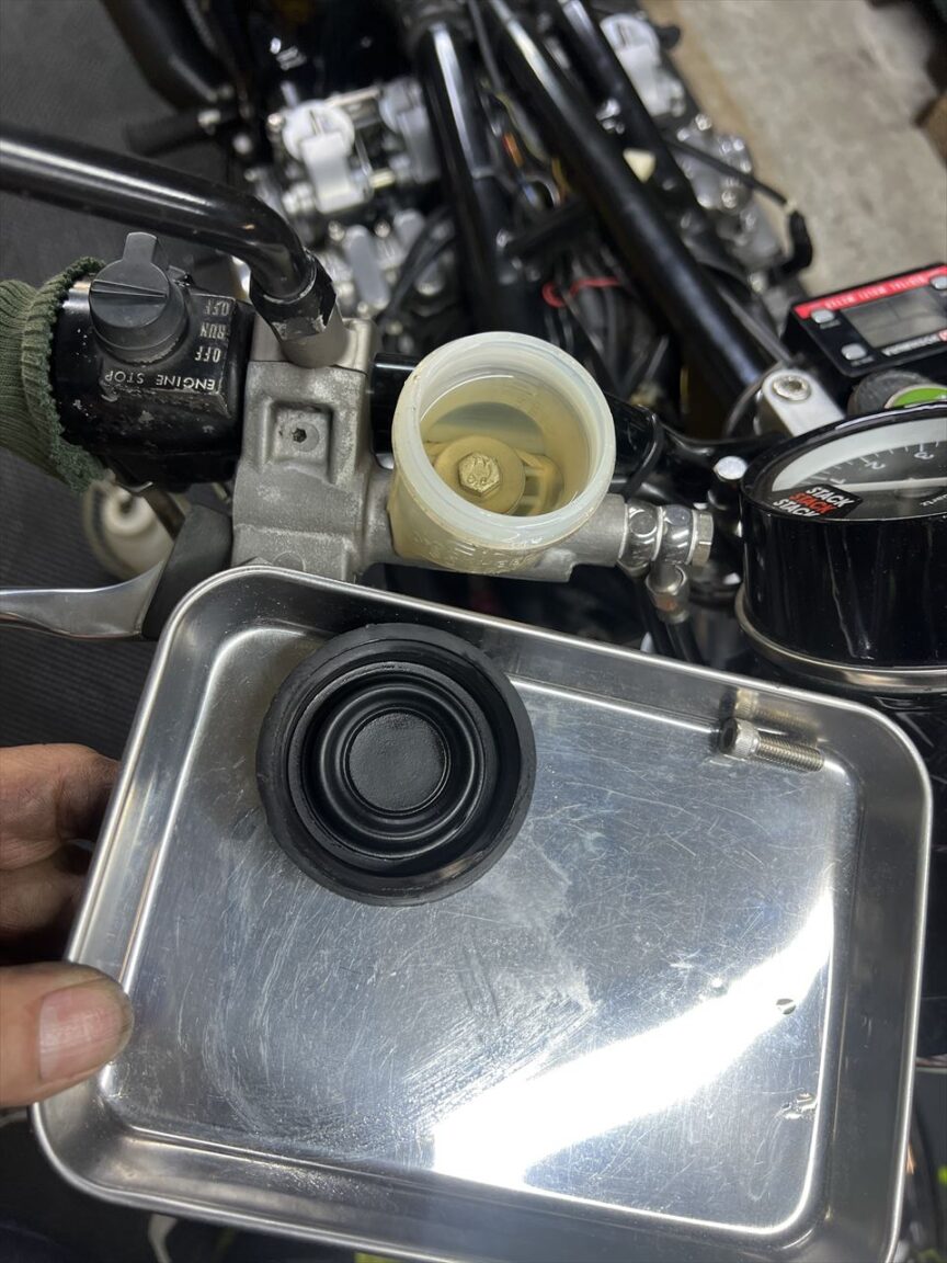 続いてブレーキフルードを交換します。先ずはフロントから。AP2ポッドキャリパーの場合、車体に装着したままだと作業し難いので、キャリパーを外してダミーローター用の板を挟み、ブリーダーを上に向けてエア抜きします。