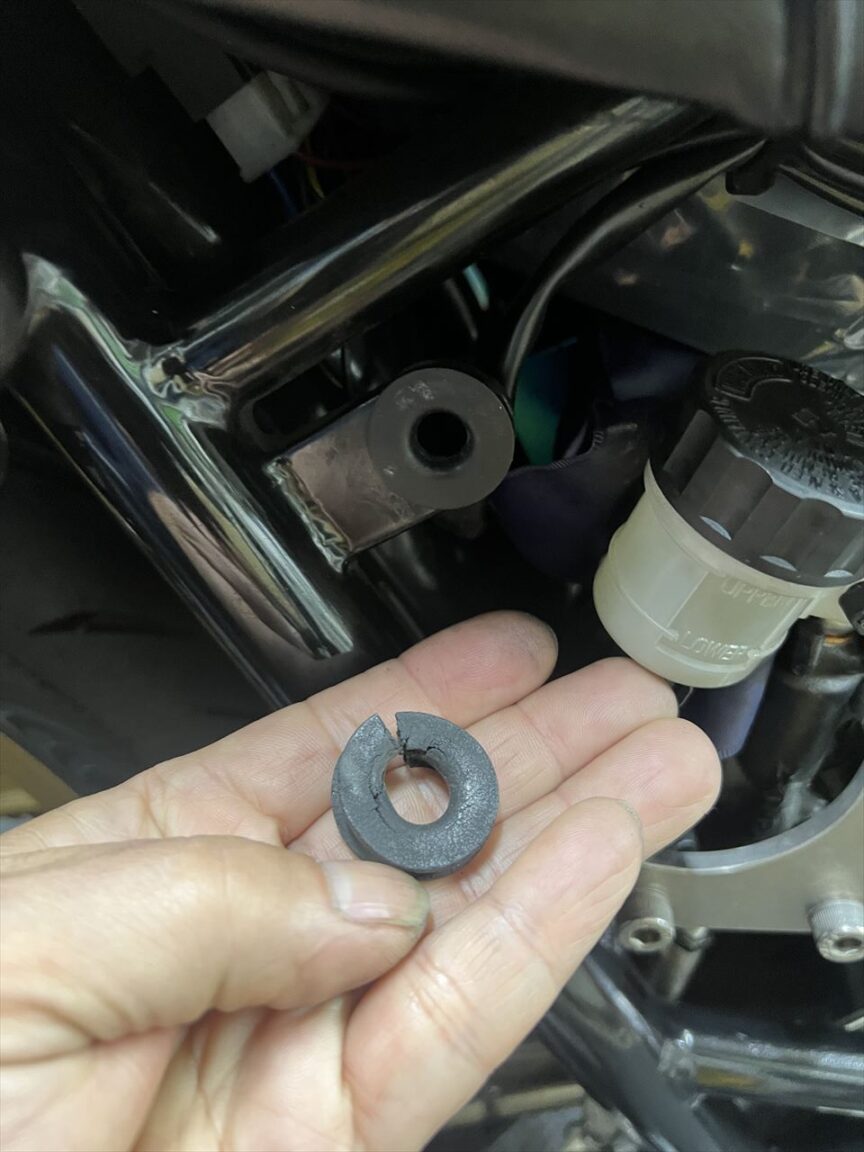 サイドカバーのグロメットがひとつ劣化していたので交換しておきます。ゴム部品は安い部品なので、純正品があるうちに新品交換しておくといいですね。少し余分に買ってストックするのもいいでしょう。ゴム部品の品質は社外品より純正品の方が総じていいと思います。