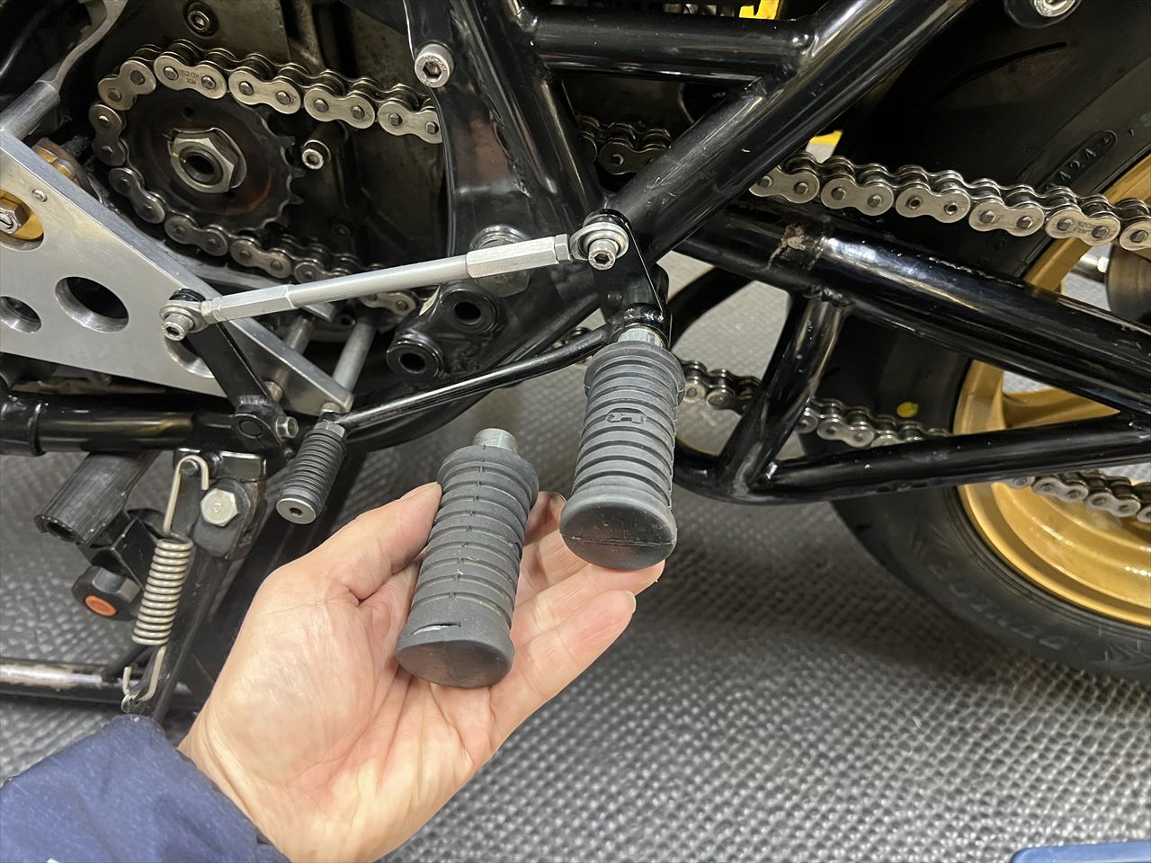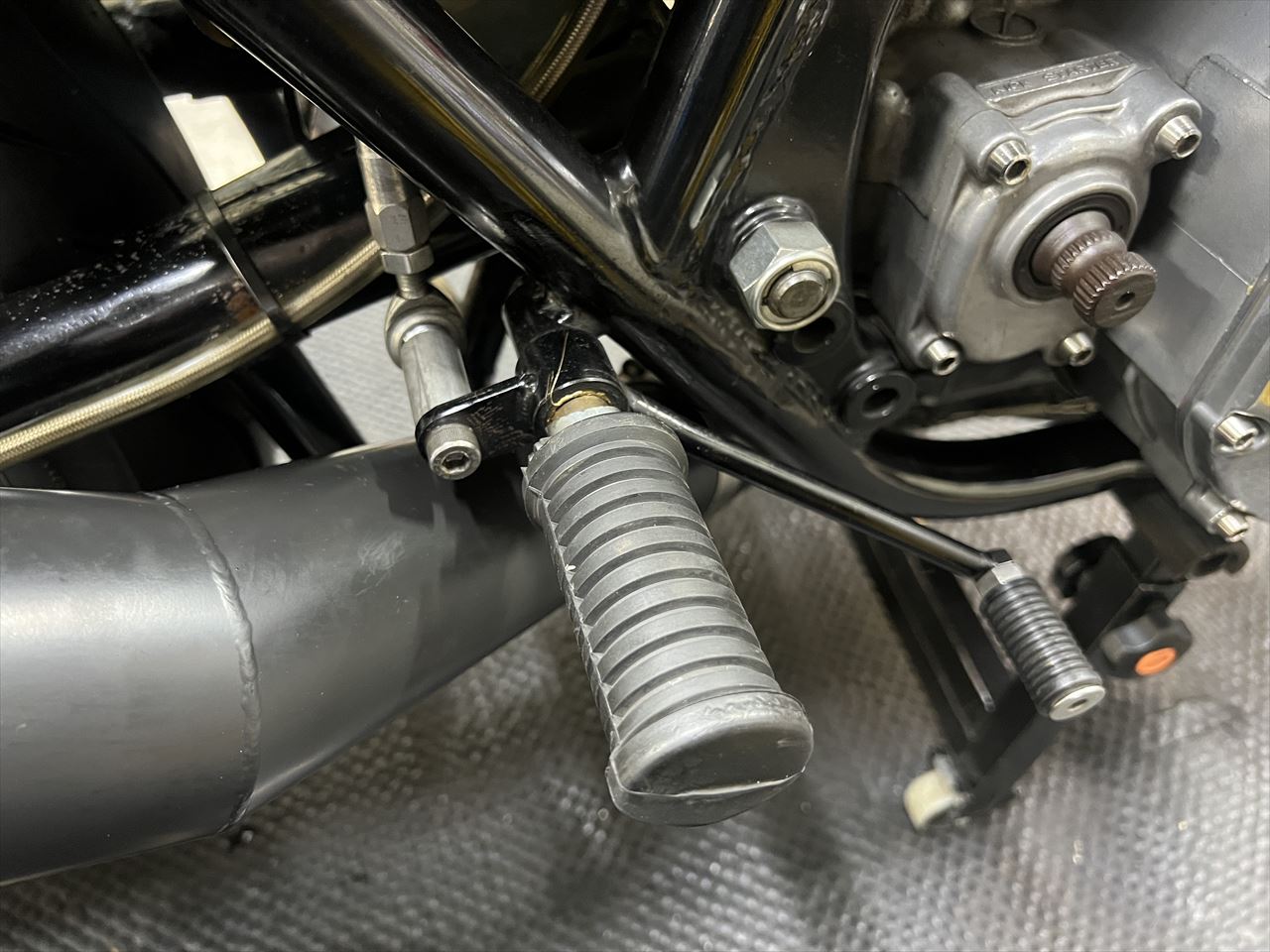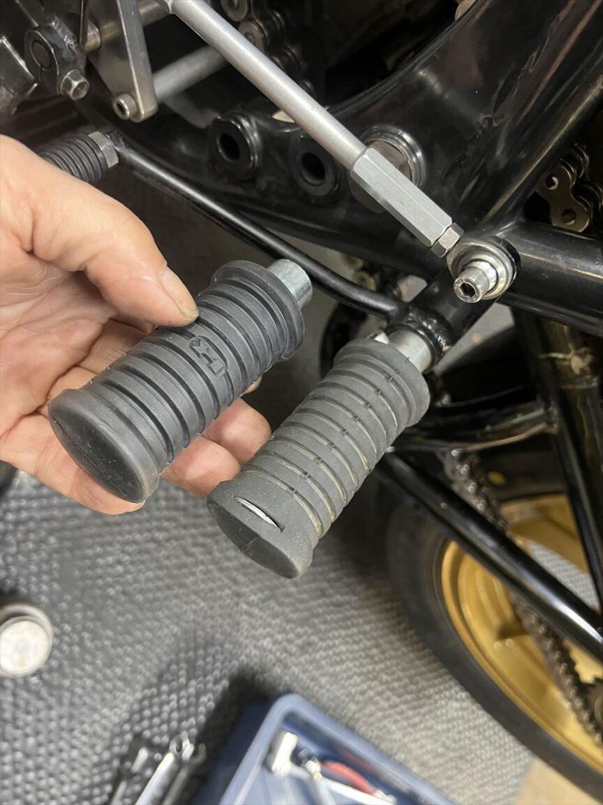ステップは弊社の直付けワークスバックステップとなっていますが、ペグのラバーが摩耗しているので交換します。使用しているペグはカワサキ純正部品のZ2タンデムステップですが、最近廃盤となりました。ひとつストックがあったのでこちらを使います。代替となる現行品のペグの場合は、エンドが内部金属が見えるタイプでKマークは無しとなります。