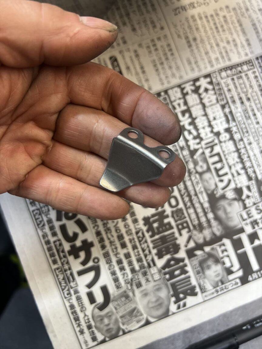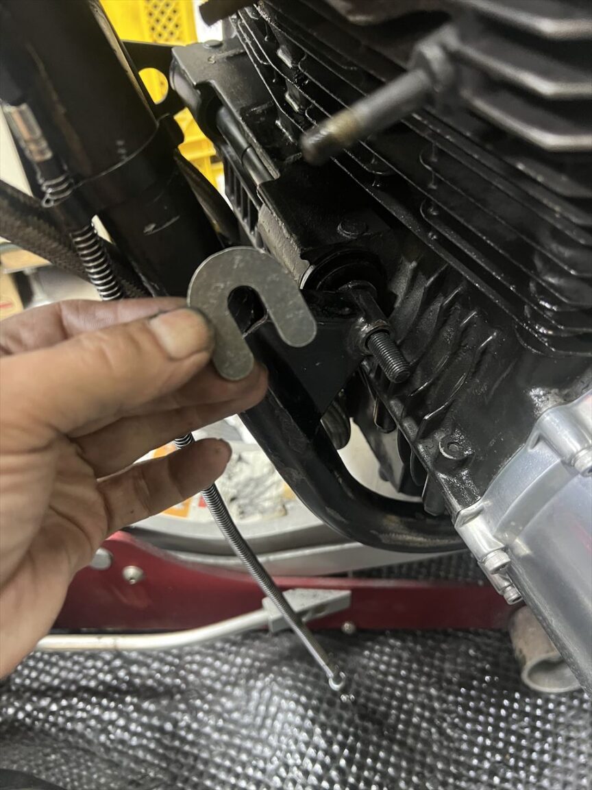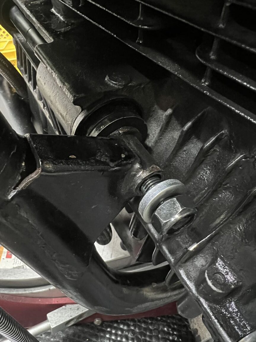 前側上部の左側には、このU字型の厚いスペーサーが入ります。この車両はきちんと付いていましたが、これが欠落している車両も散見され、その際はエンジンが左に寄ってしまうことになります。
