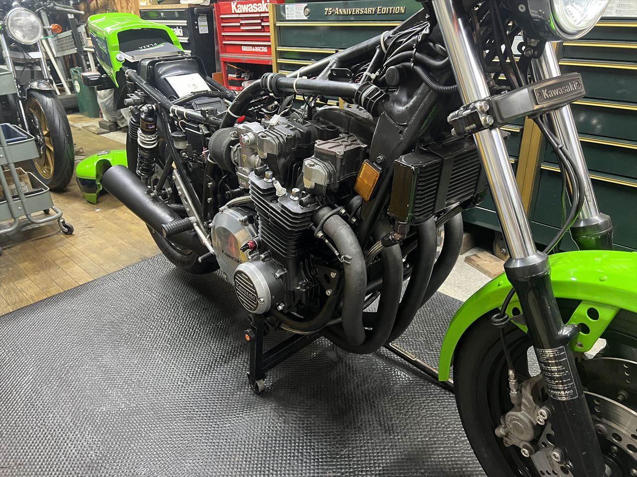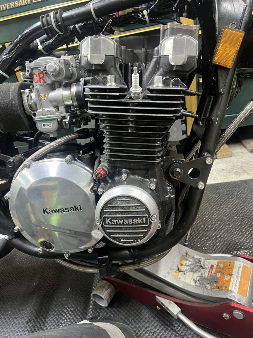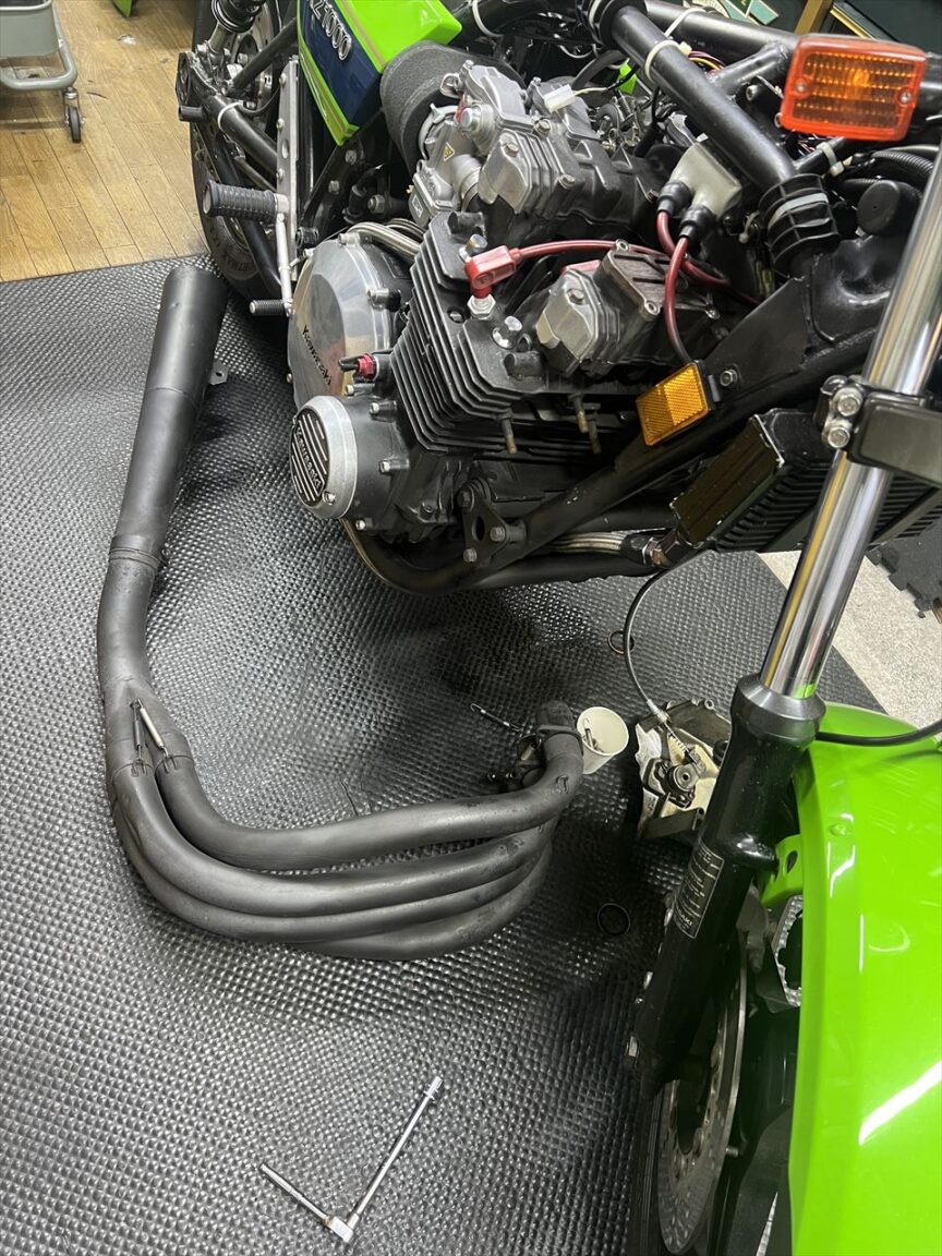 続いてエンジンマウントインシュレーター交換です。エンジンを上にずらすのでマフラーを外します。