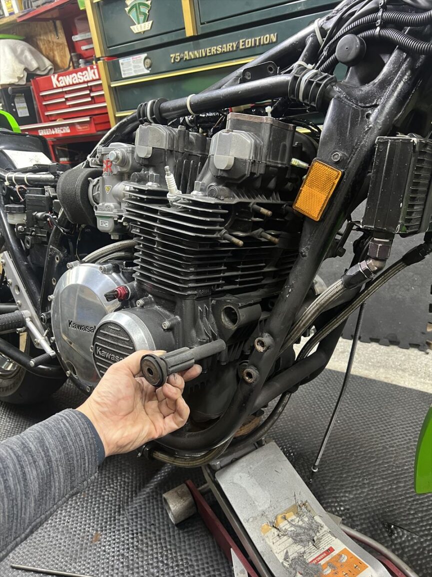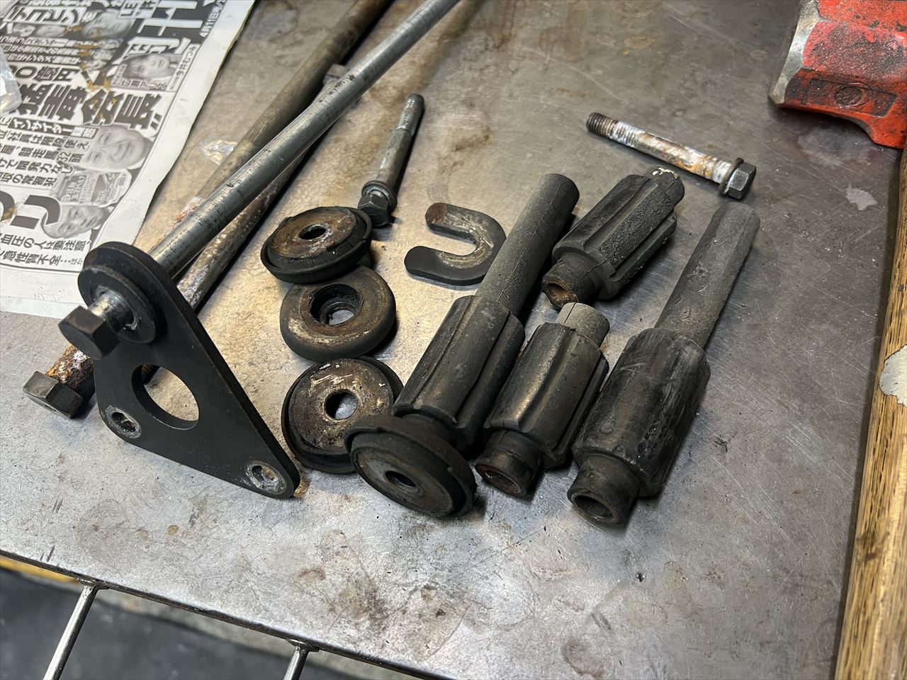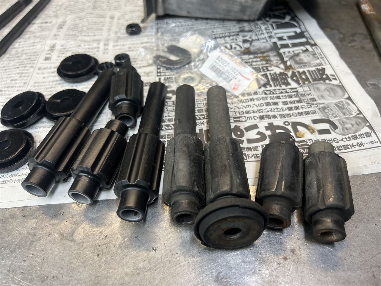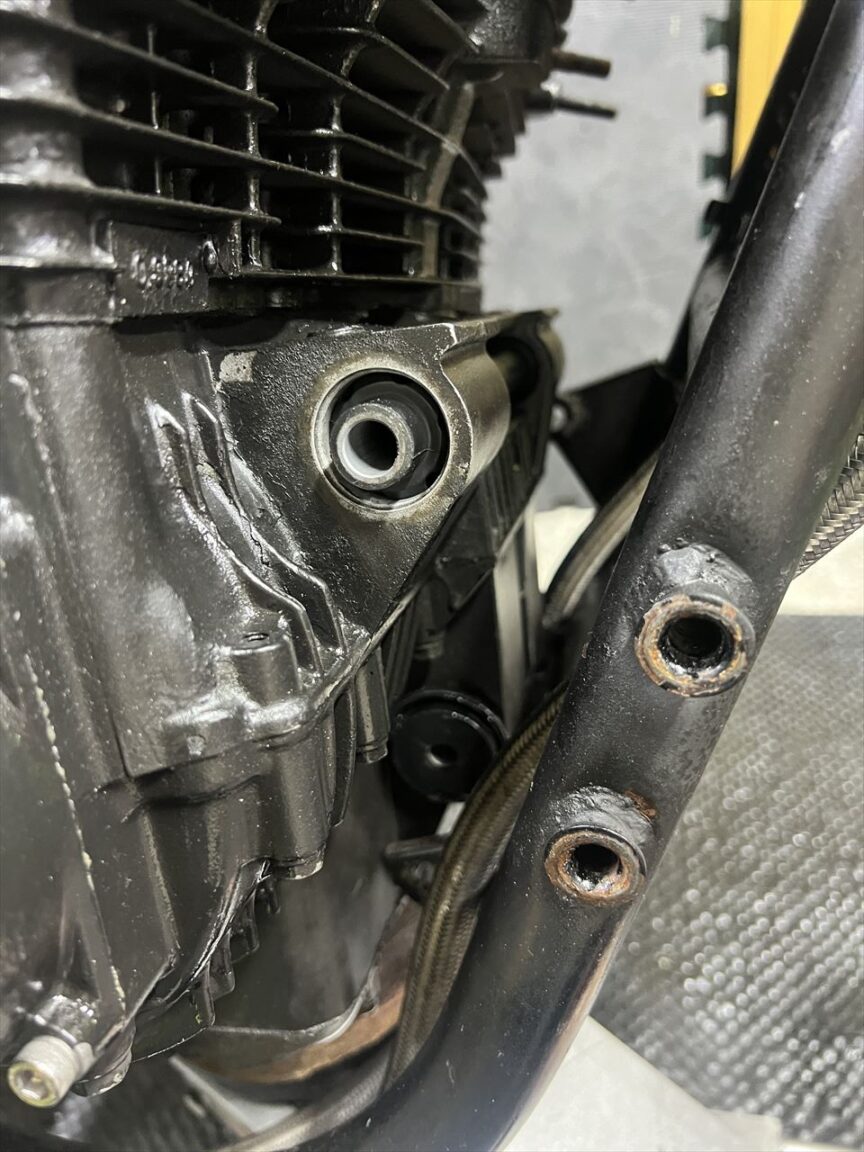 外したインシュレーターがこちら。硬化して外径が摩耗し、かなり痩せていますね。その分エンジンがチェーン張力で後ろに引っ張られてズレることになります。エンジン振動もフレームに伝わりやすくなっています。