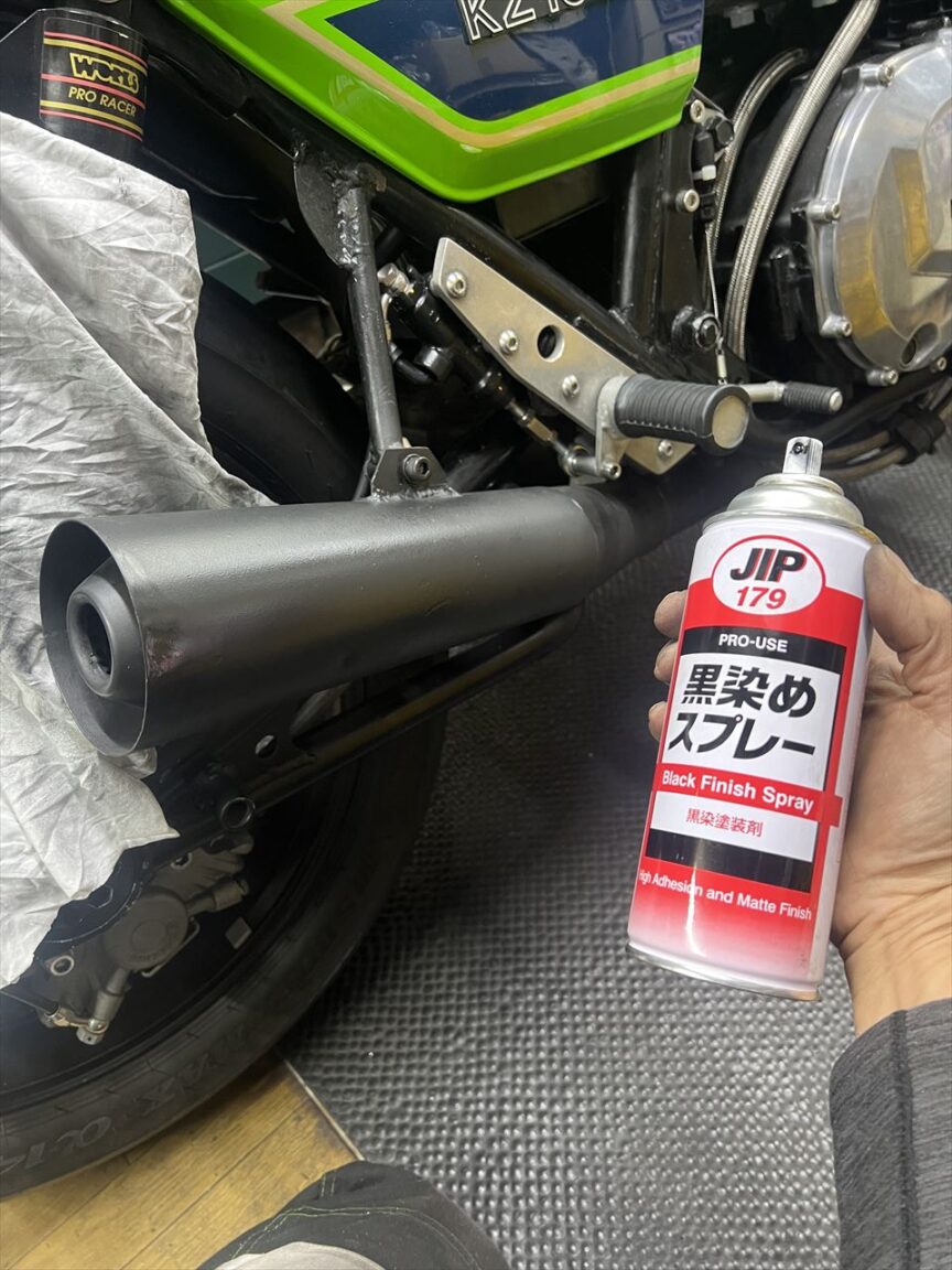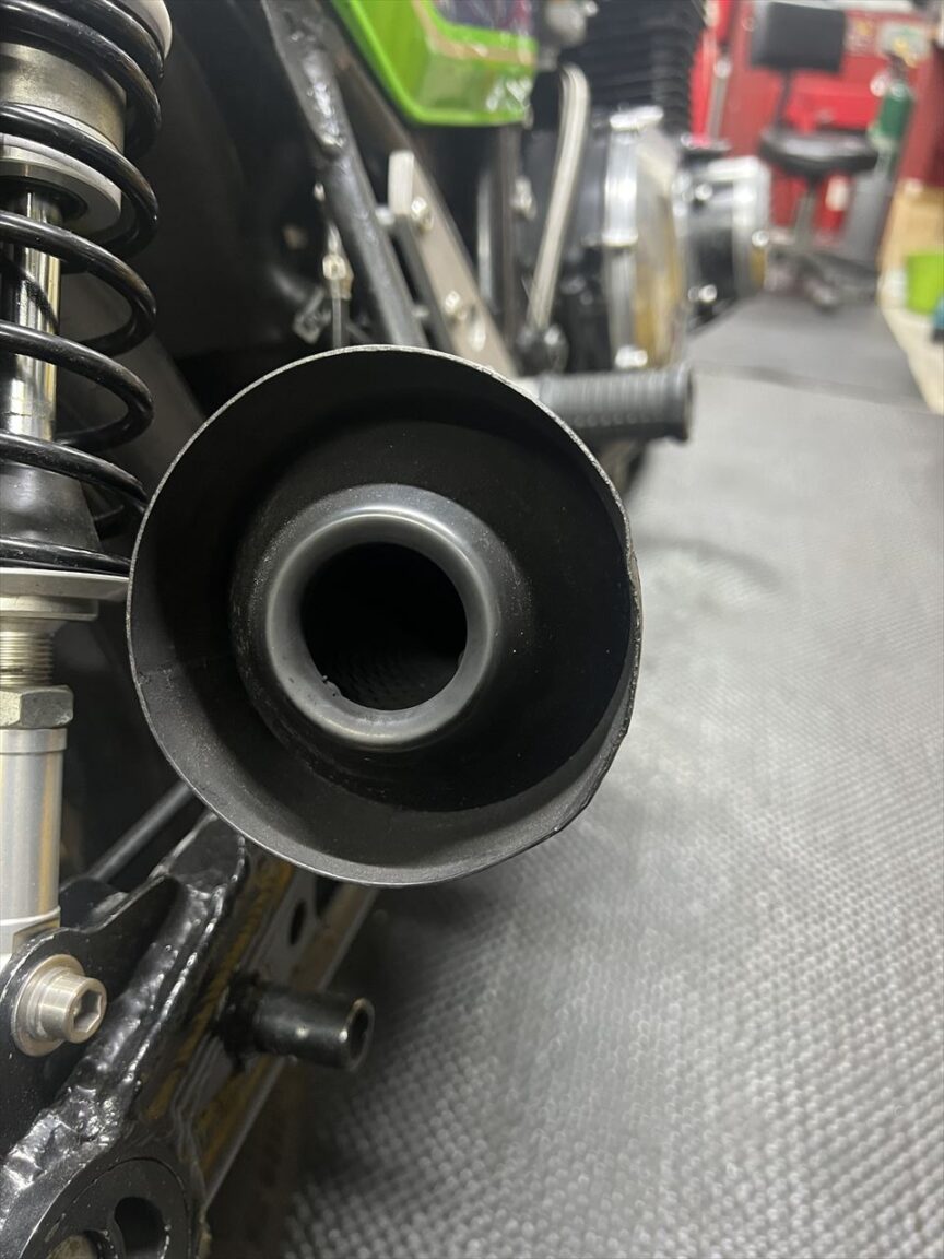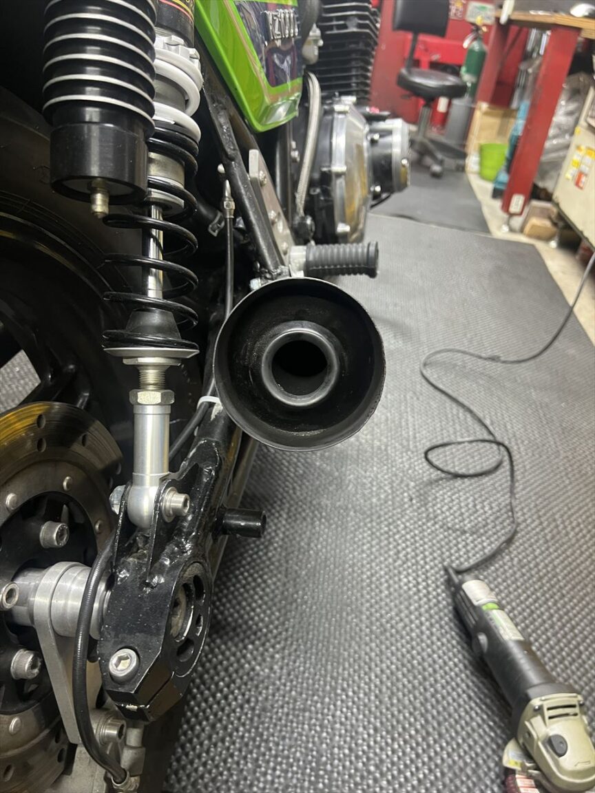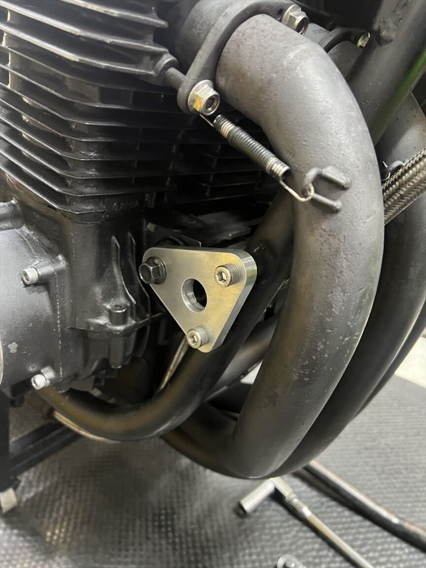 修正後はこちら。サビの多いこのマフラーは将来交換予定なので、現状はあまり手をかけてもという感じ。新規マフラーに交換の際、少々雑な作りの既存サイレンサーステーも、現物合わせで作り直しする予定です。