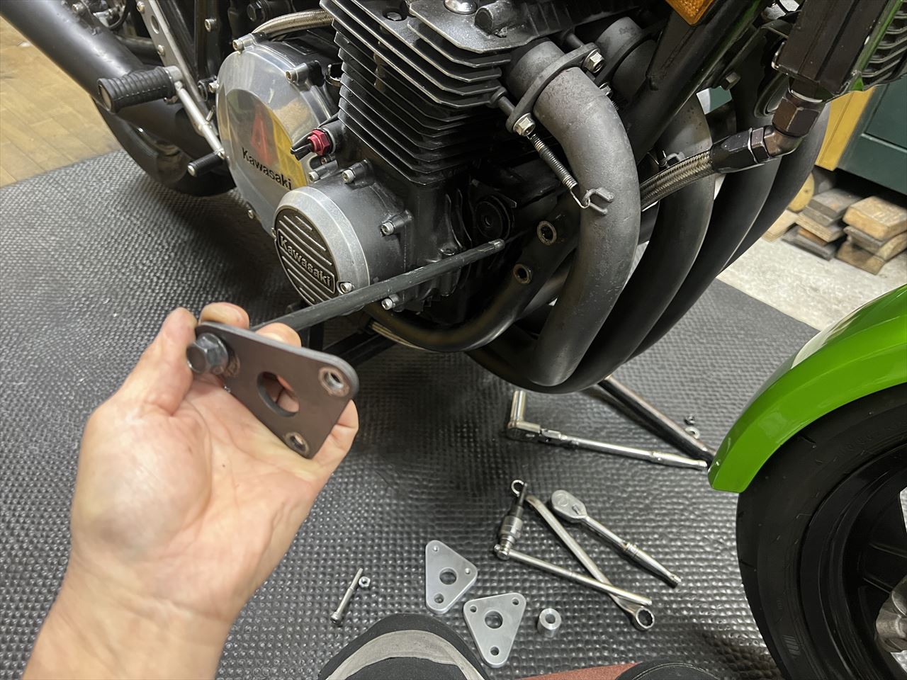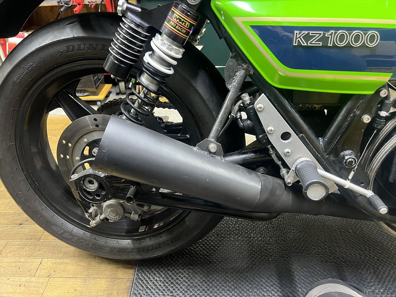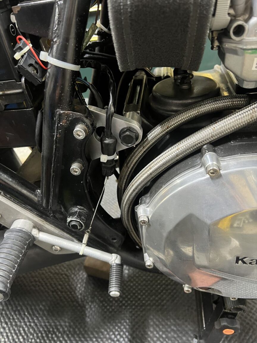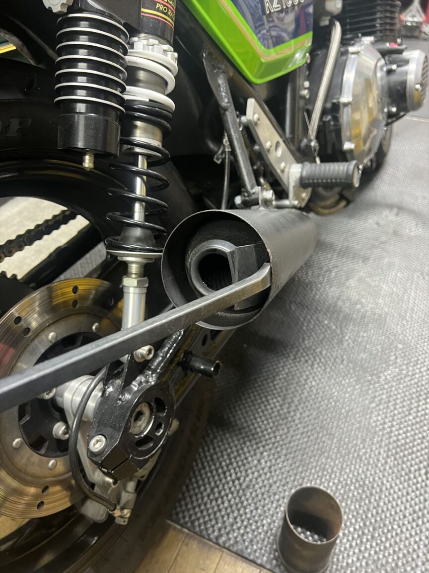修正後はこちら。サビの多いこのマフラーは将来交換予定なので、現状はあまり手をかけてもという感じ。新規マフラーに交換の際、少々雑な作りの既存サイレンサーステーも、現物合わせで作り直しする予定です。