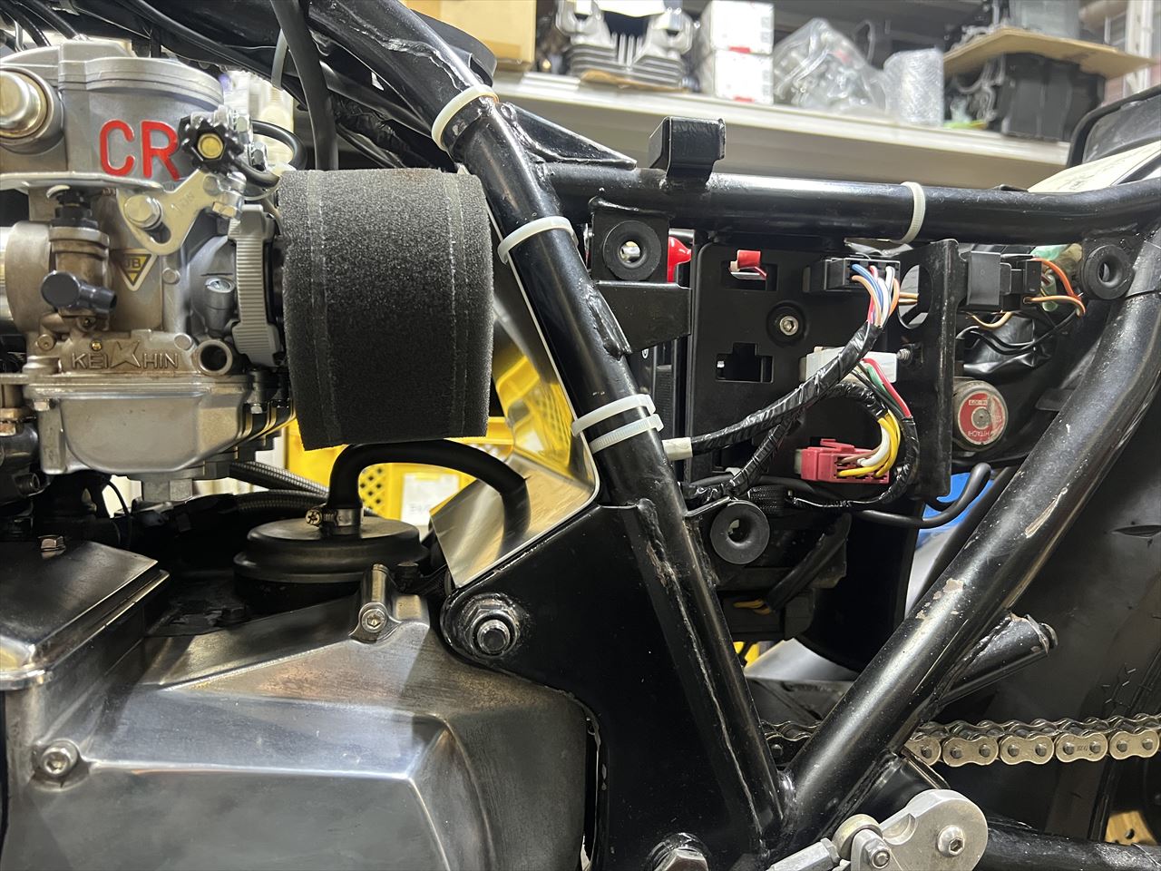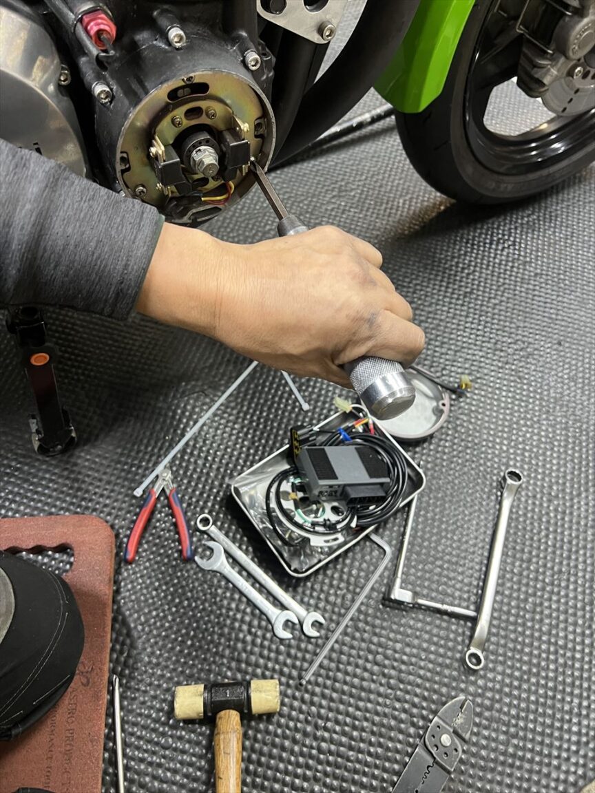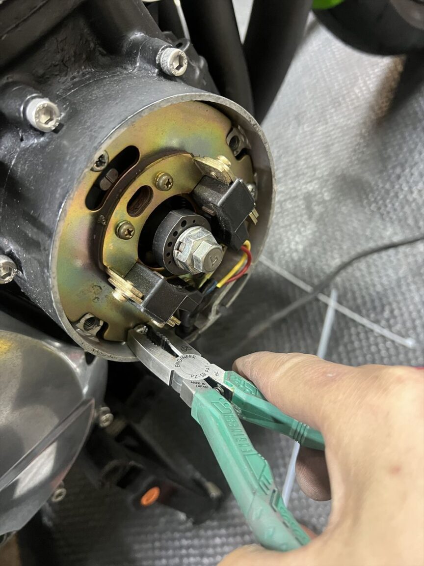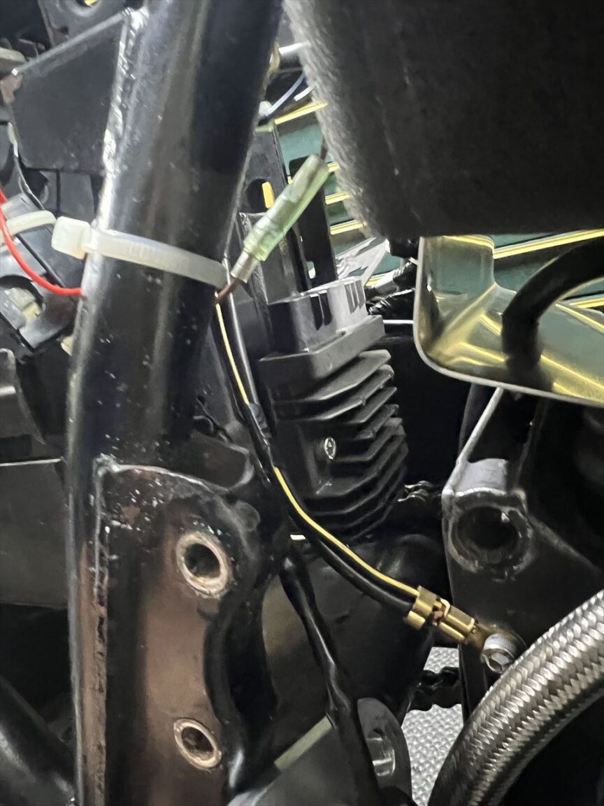 点火系はウオタニSP2に変更したので、既存の純正イグナイターをバッテリーケース前から外します。