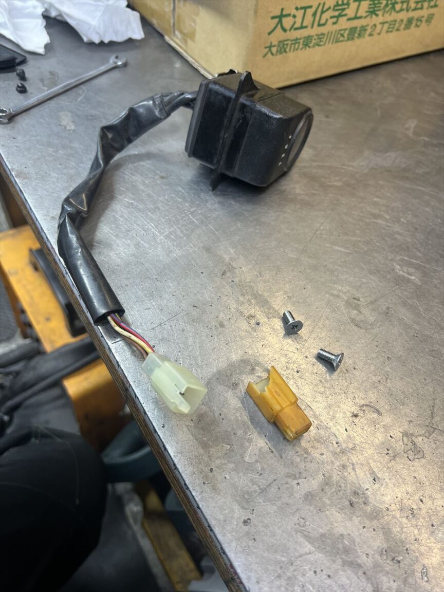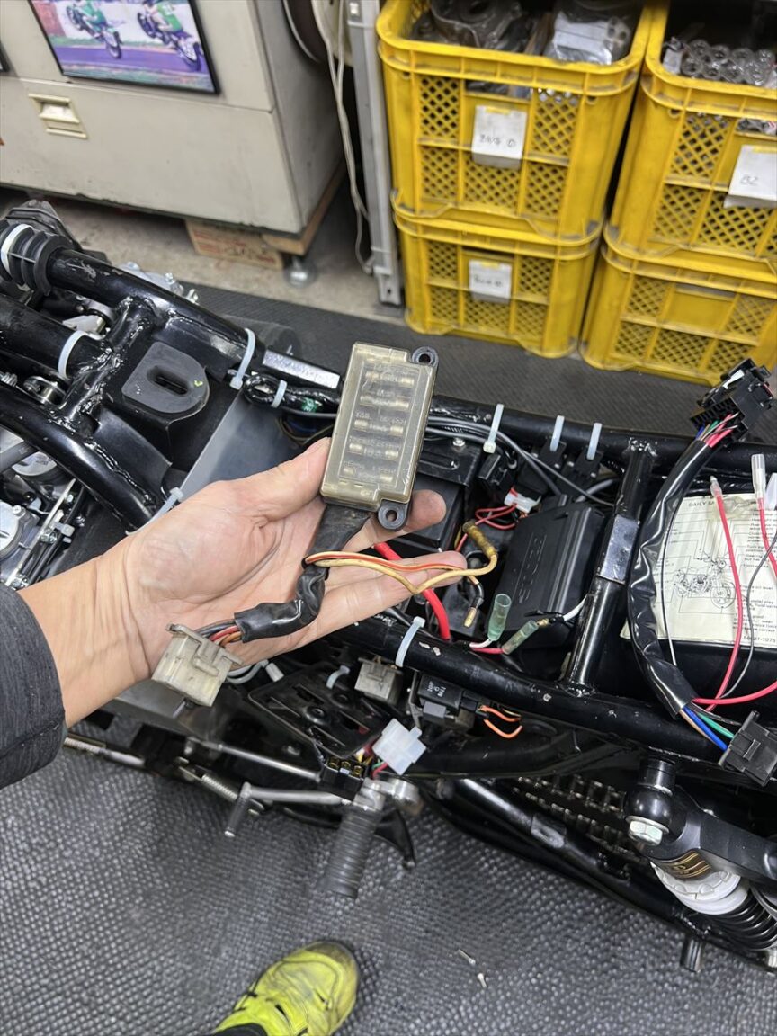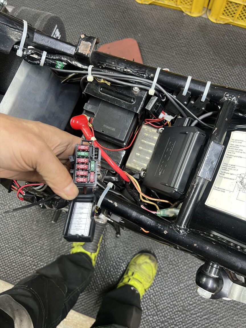 既存の管ヒューズタイプのヒューズBOXを外します。新しいヒューズBOXはJ用なのでカプラーオンです。