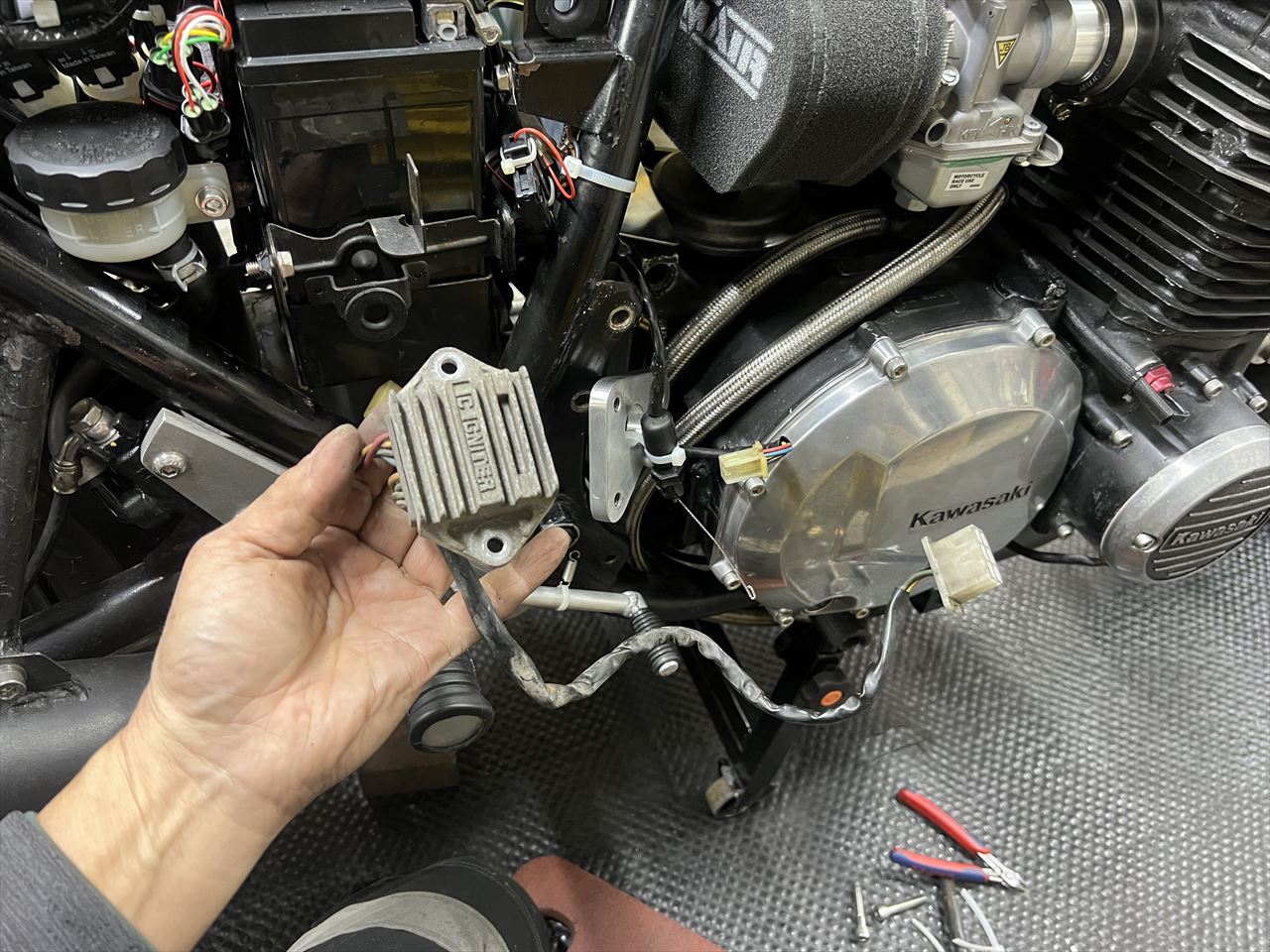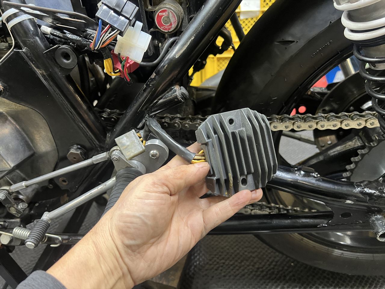 既存のレギュレーターをバッテリーケースの下から外します。交換歴があるようですが、より信頼性の高いMOSFET型に交換します。