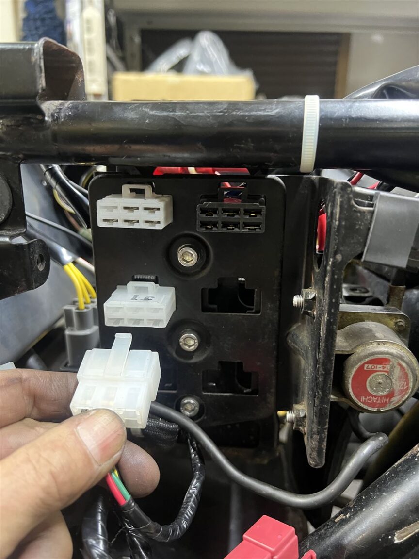 メインハーネスのカプラーパネルは、新しいヒューズBOXからの黒カプラーと、レギュレーターからの白カプラーの2個が活線。手に持っているのは余っているノーマルイグナイター用のカプラーですが、電源が来ているので空でメスカプラーをパネルに取り付けそれに指しておきます。
