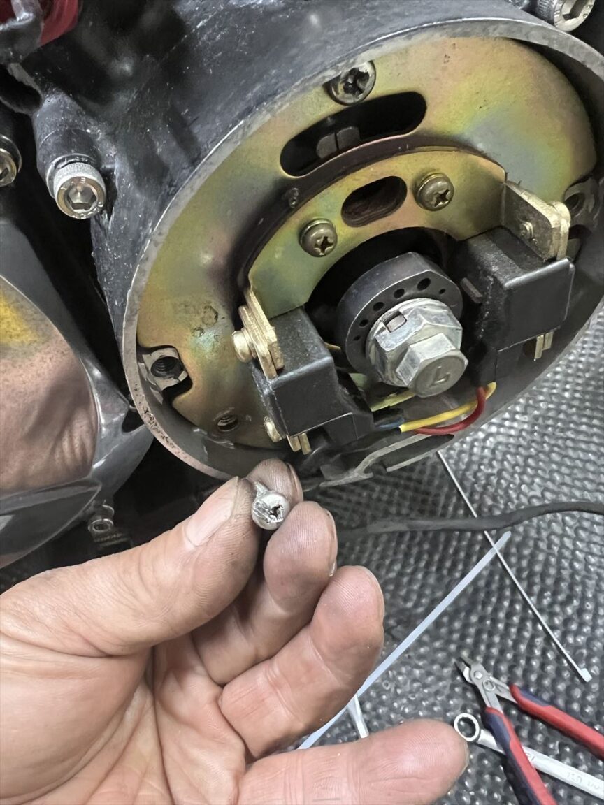 ピックアップコイルをSP2の物に交換します。ノーマルの取り付けネジは十字穴のトナスネジですが、例によってインパクトドライバーでも緩みません。