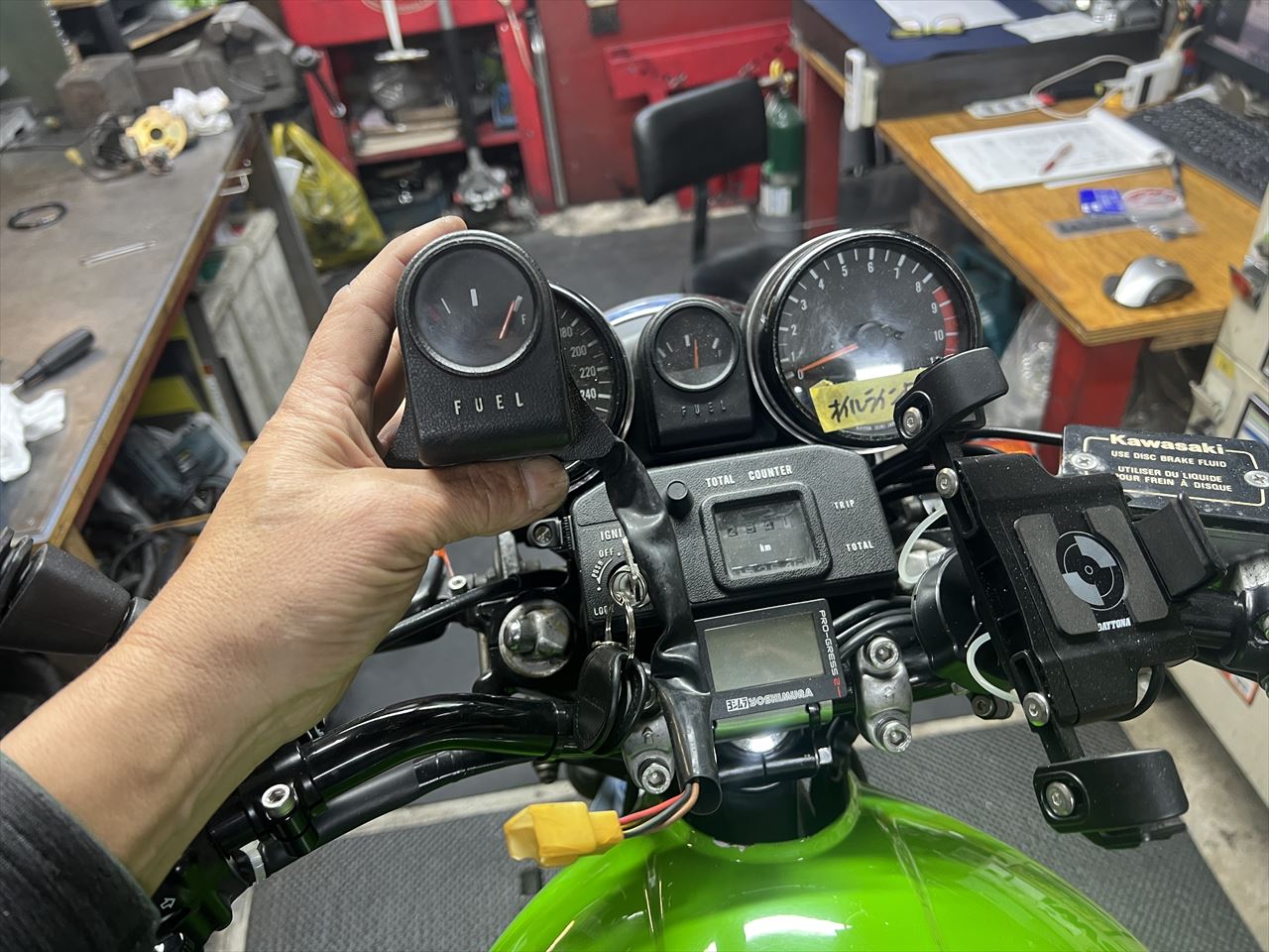 既存のフューエルメーターは調子が悪かったので、オーナーさんお持ち込みの別のノーマルメーターに交換します。