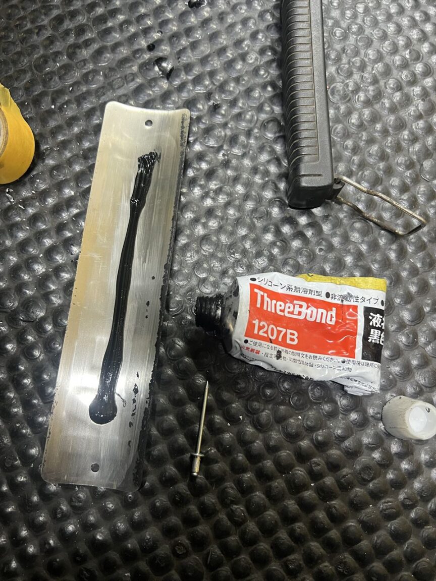 さらに、お持ち込みのKERKERエンブレムを取り付けます。リベットだけでは振動で緩みやすいので、裏面にシリコンボンドを塗布してから取り付けます。外す際はワイヤーなどでボンドもカットすればきれいにはがせます。