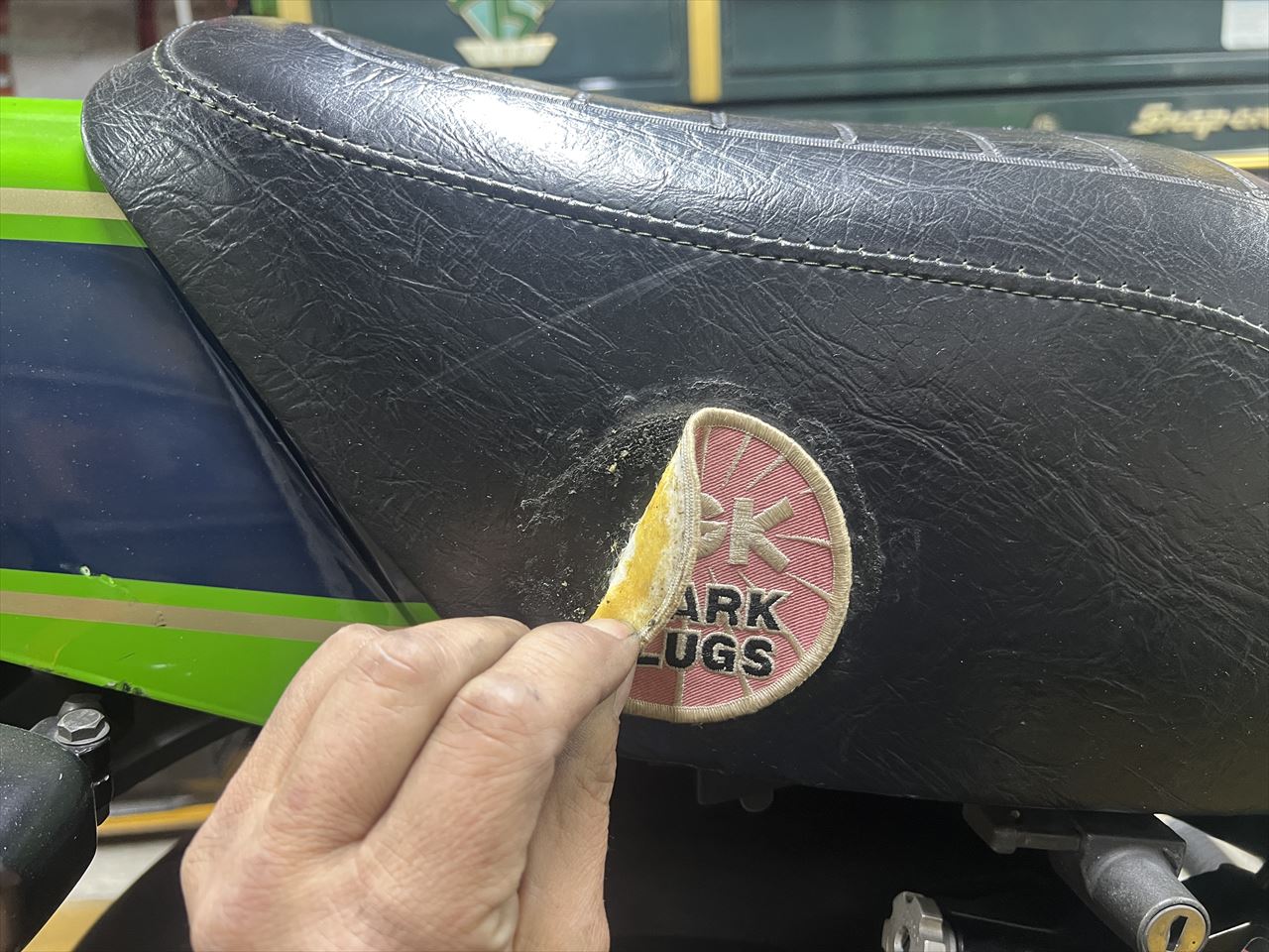 最後にシートのエンブレム交換です。既存の物は刺繍のワッペンをボンドで張り付けてありました。日焼けして剥がれ欠けています。