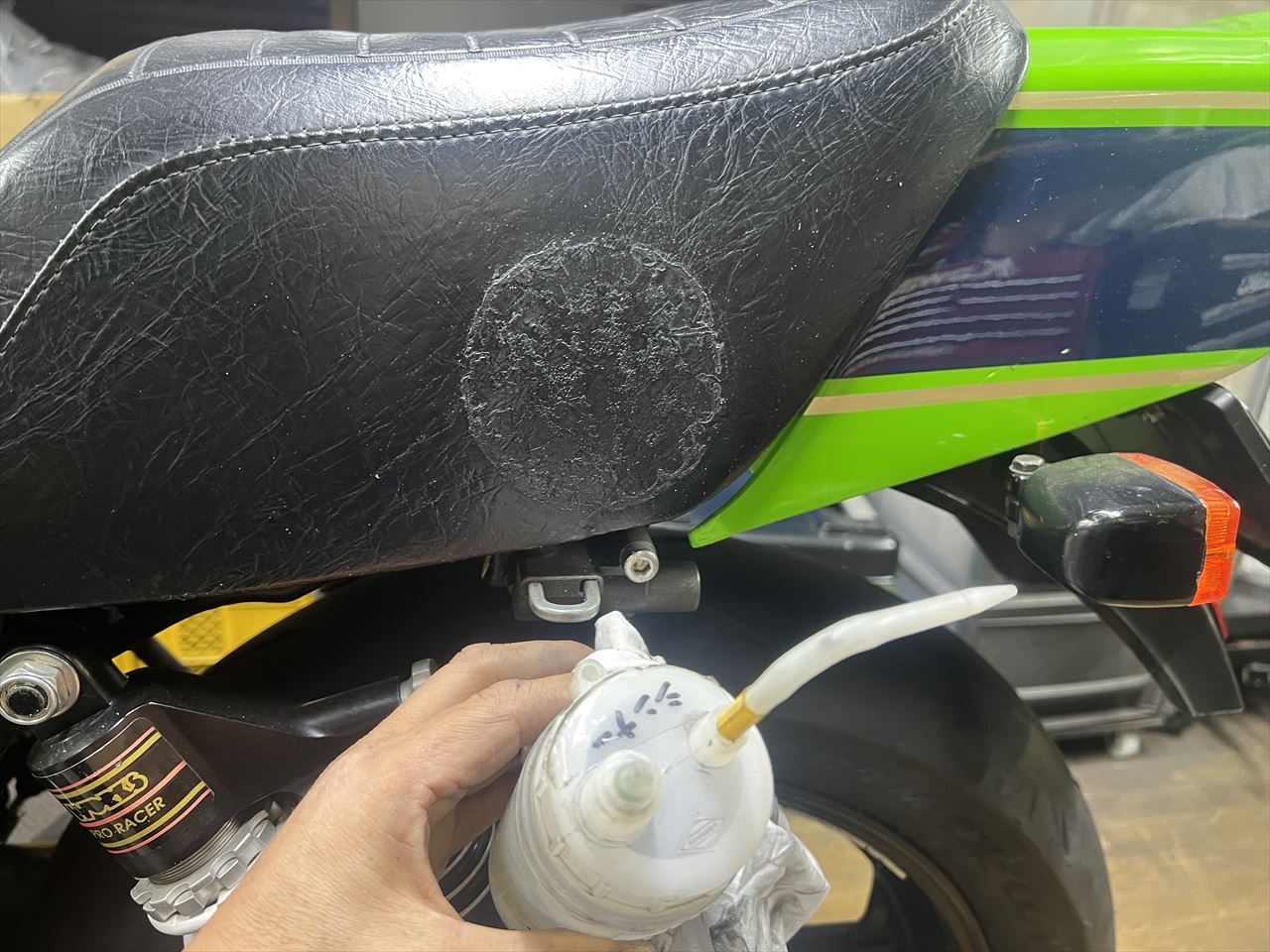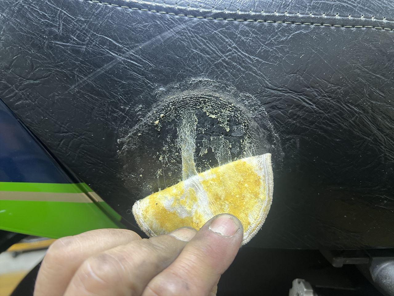 シート表皮を痛めないよう、溶剤でボンドの残りなどを清掃しますが、このくらいが限界のようです。