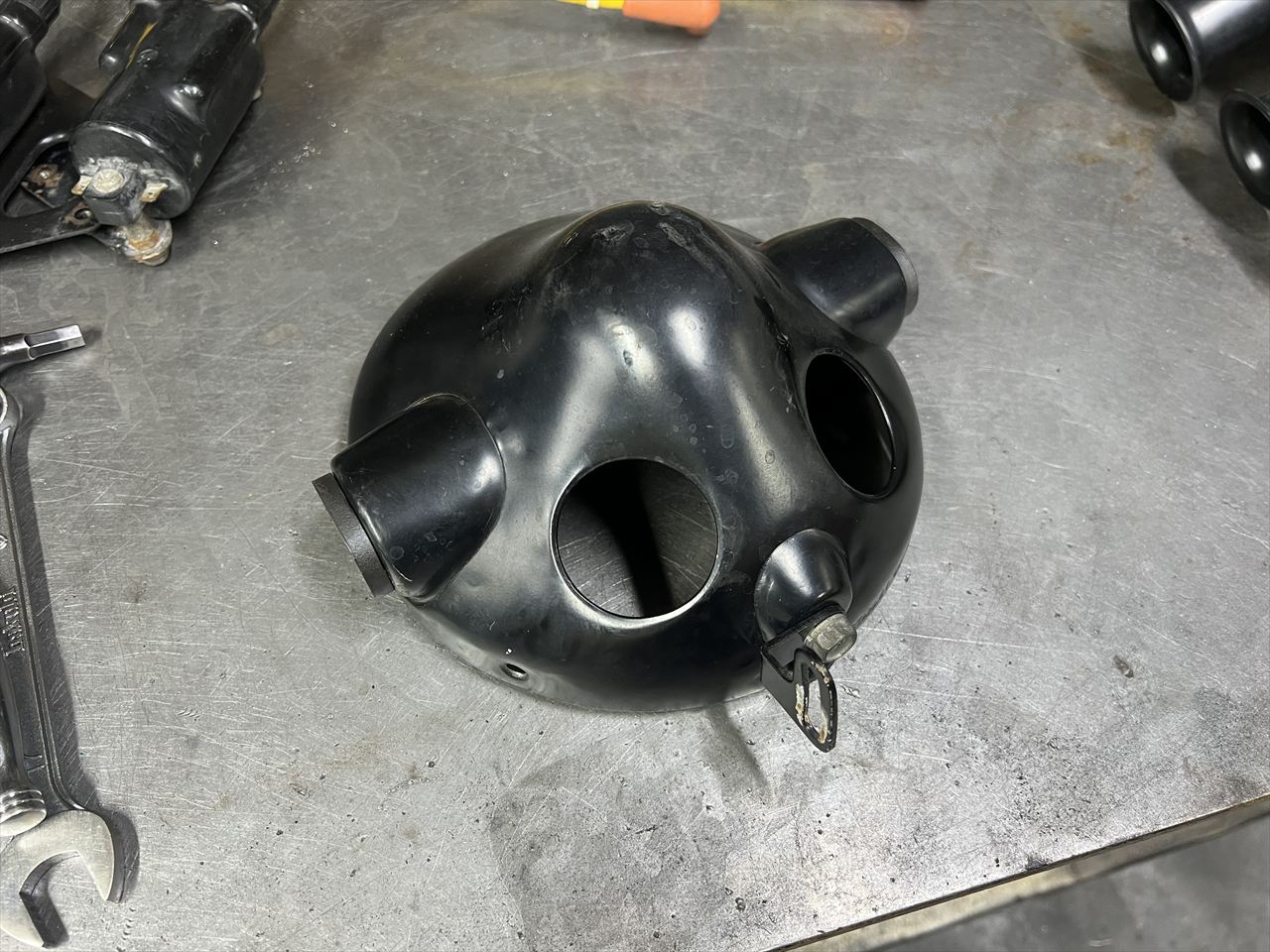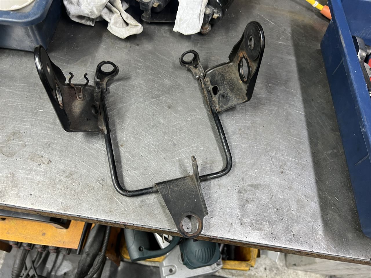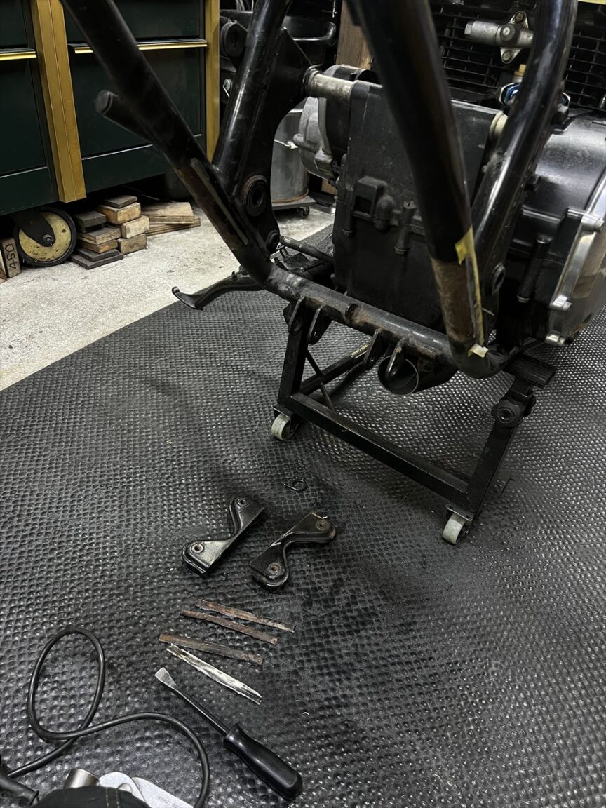 ノーマルのヘッドライトステーもリペイントします。これはなかなか原形をとどめているのでいいコンディションですね。フレーム全般比較的きれいなので、酷い転倒歴など無いだろういい車両と言えます。
