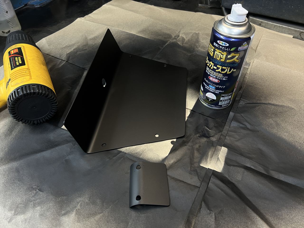 オーナーさんのお好みで艶消しブラックに塗装します。手前はヨシムラテンプメーターのステーです。あまり目立たないところなどは缶スプレー塗装でコストダウン。