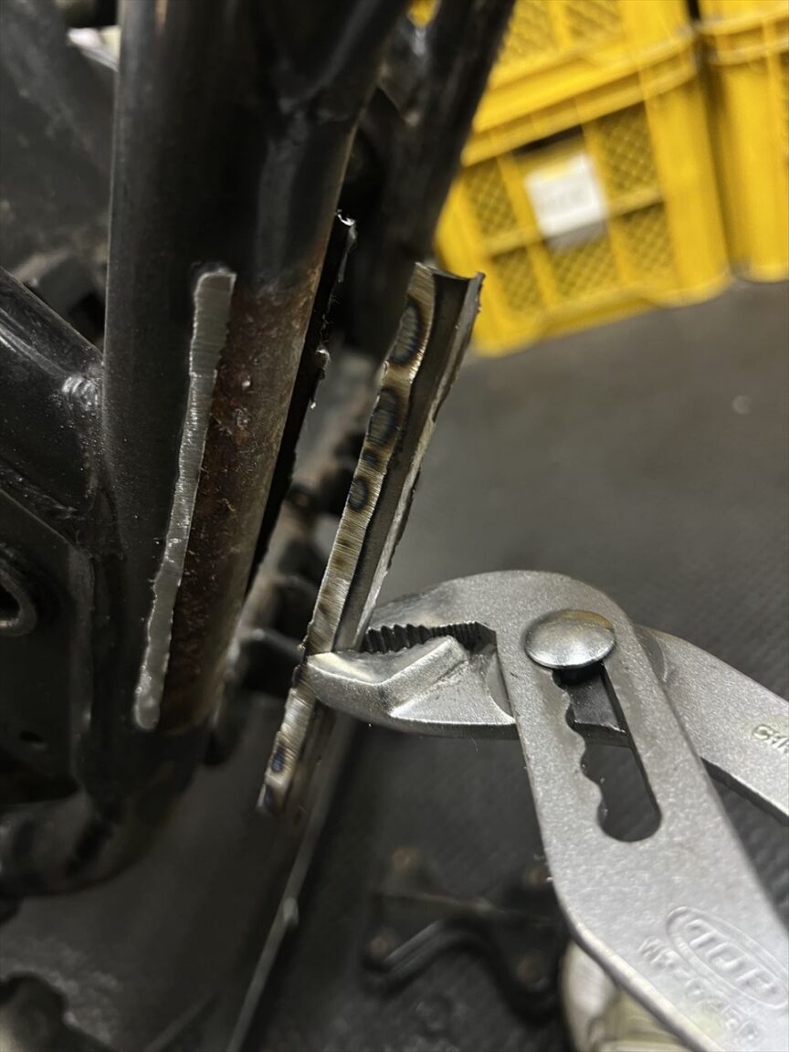 耳を起こしてグリグリすると切れて取れます。母材のフレームを傷つけない方法のひとつです。