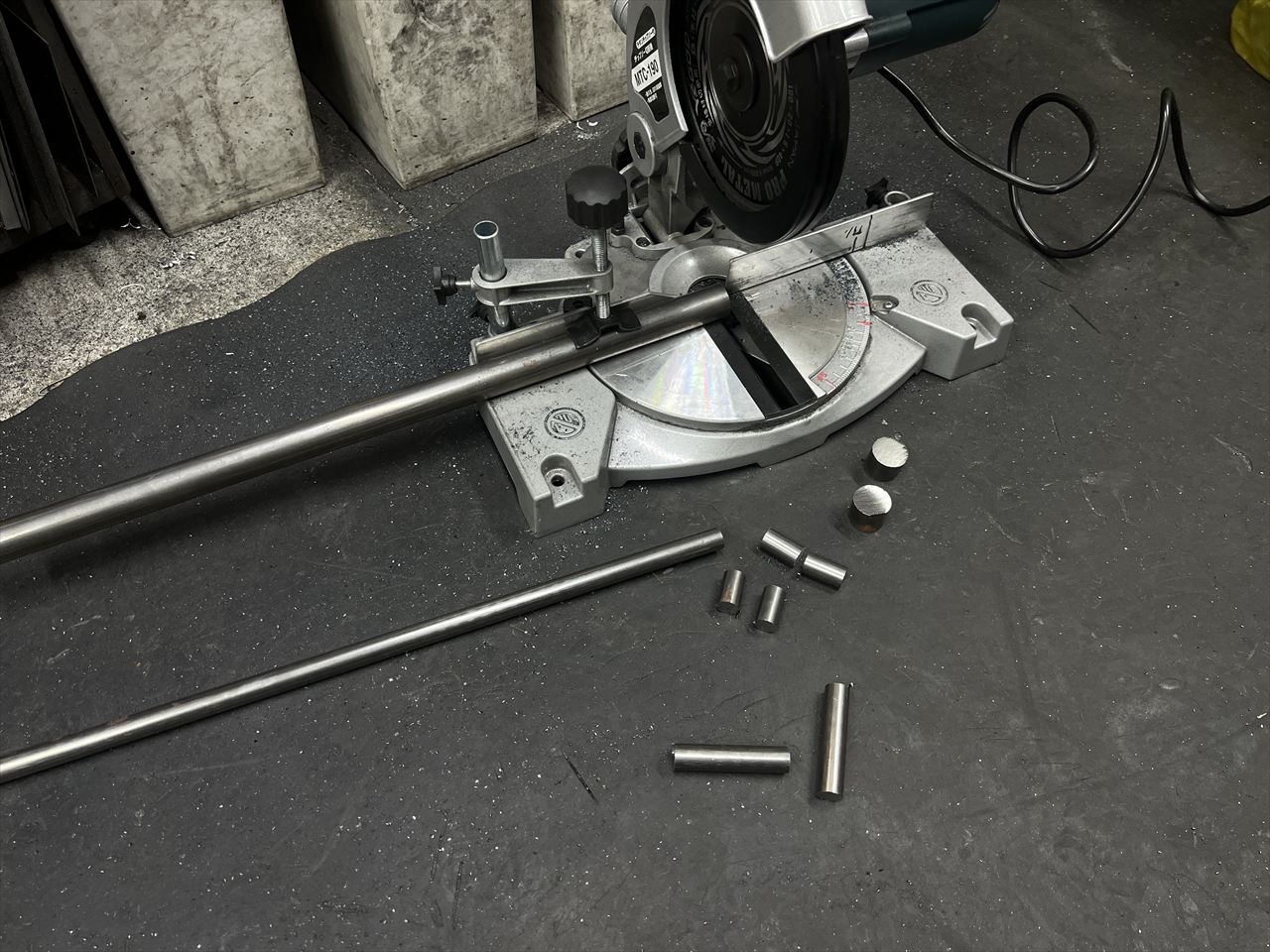 スチールの無垢棒からも、必要なパーツ素材を切り出します。主に使っているのはS45Cの磨き丸棒という材質。外径が高精度に仕上がっているので、完成品の外径に近い物を数種類用意して使います。ちなみにクランク点検棒はこれのφ17ミリなどを切断したものです。
