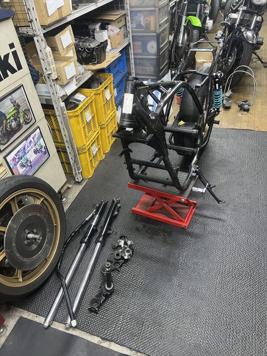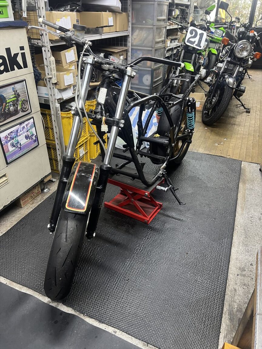 サイドスタンドは脱着式に変更するので、ノーマルのサイドスタンドブラケットは削除しました。