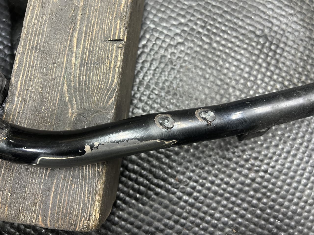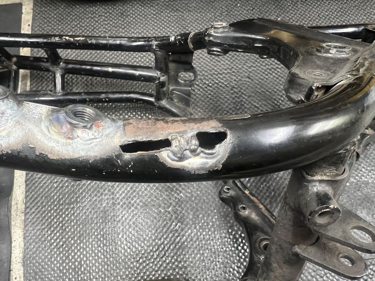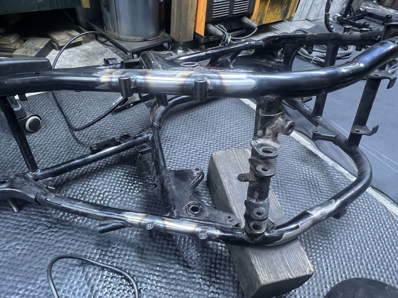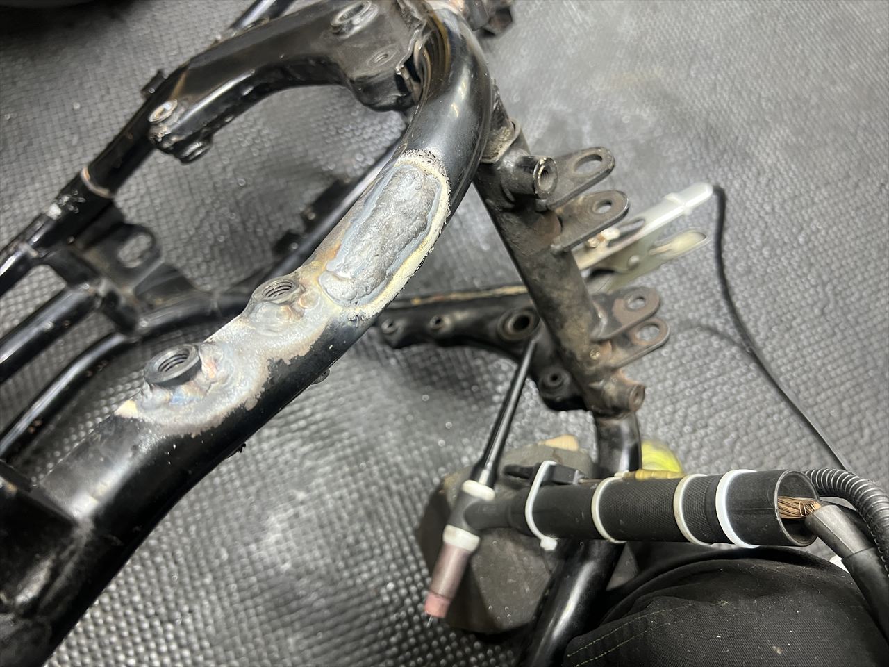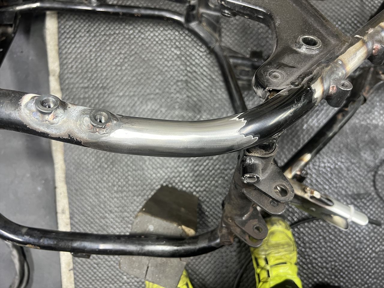 ワークスバックステップのボス4個を溶接した個所、全周溶接がいきわたっているか確認します。これで塗装前のフレーム加工は完了です。