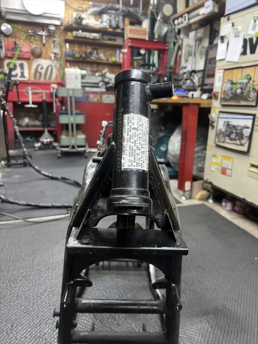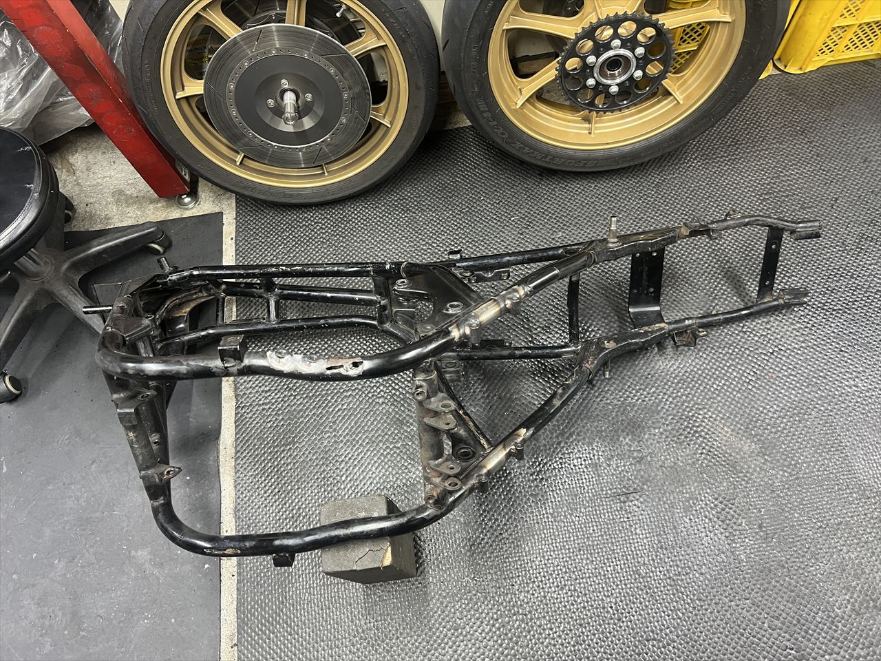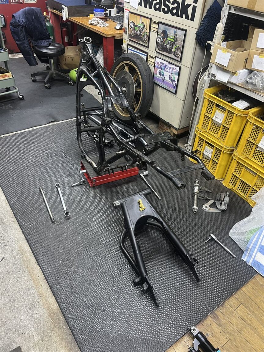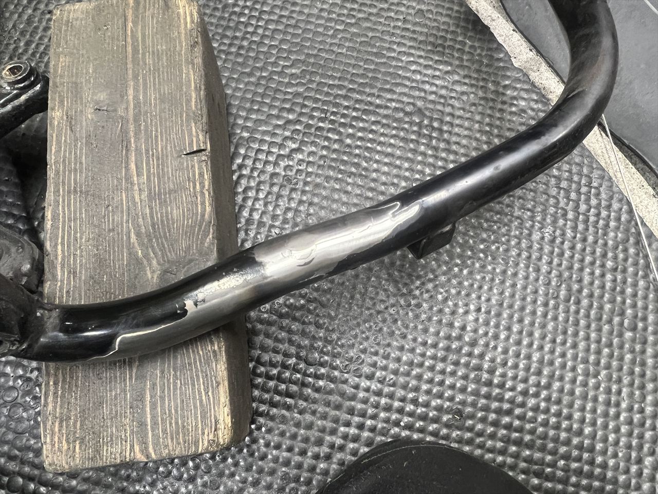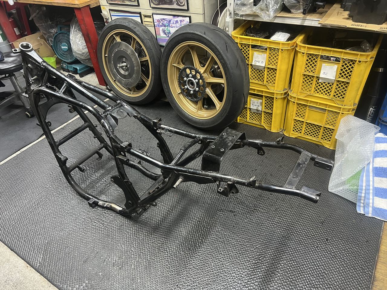 ワークスバックステップのボス4個を溶接した個所、全周溶接がいきわたっているか確認します。これで塗装前のフレーム加工は完了です。