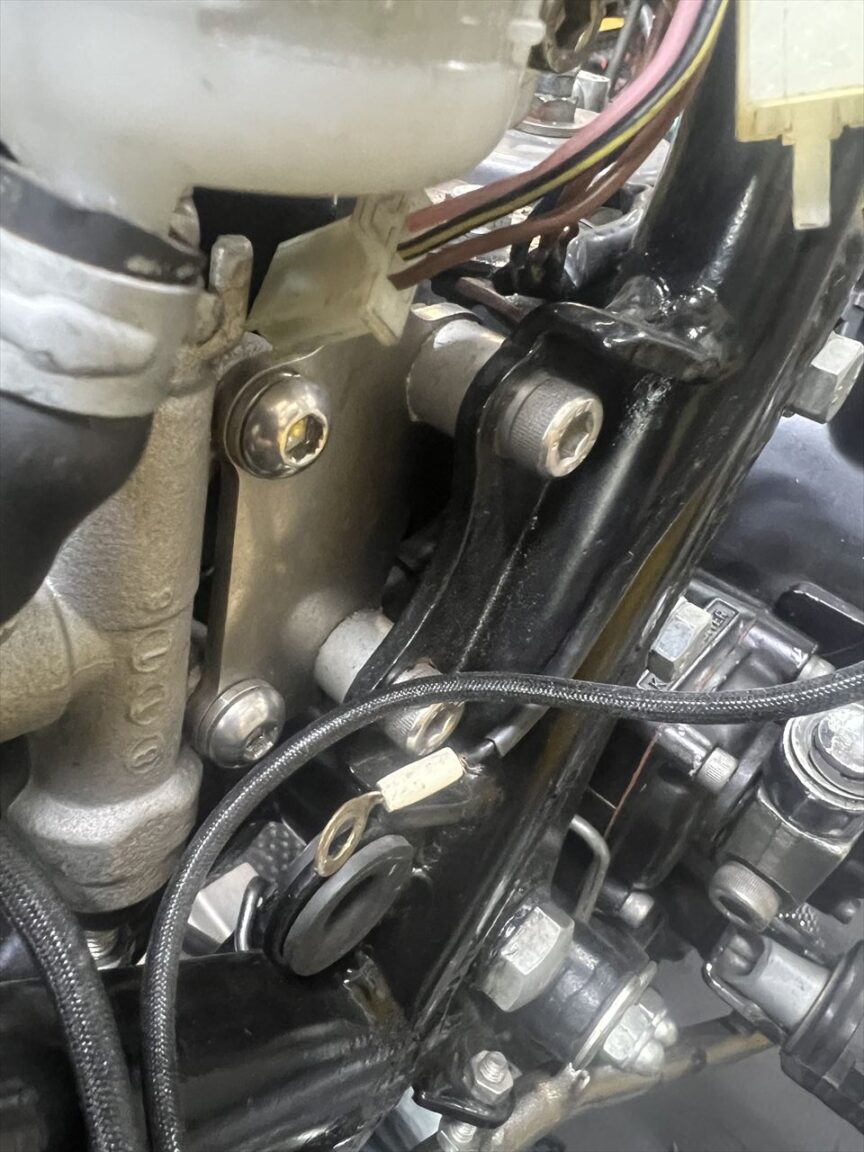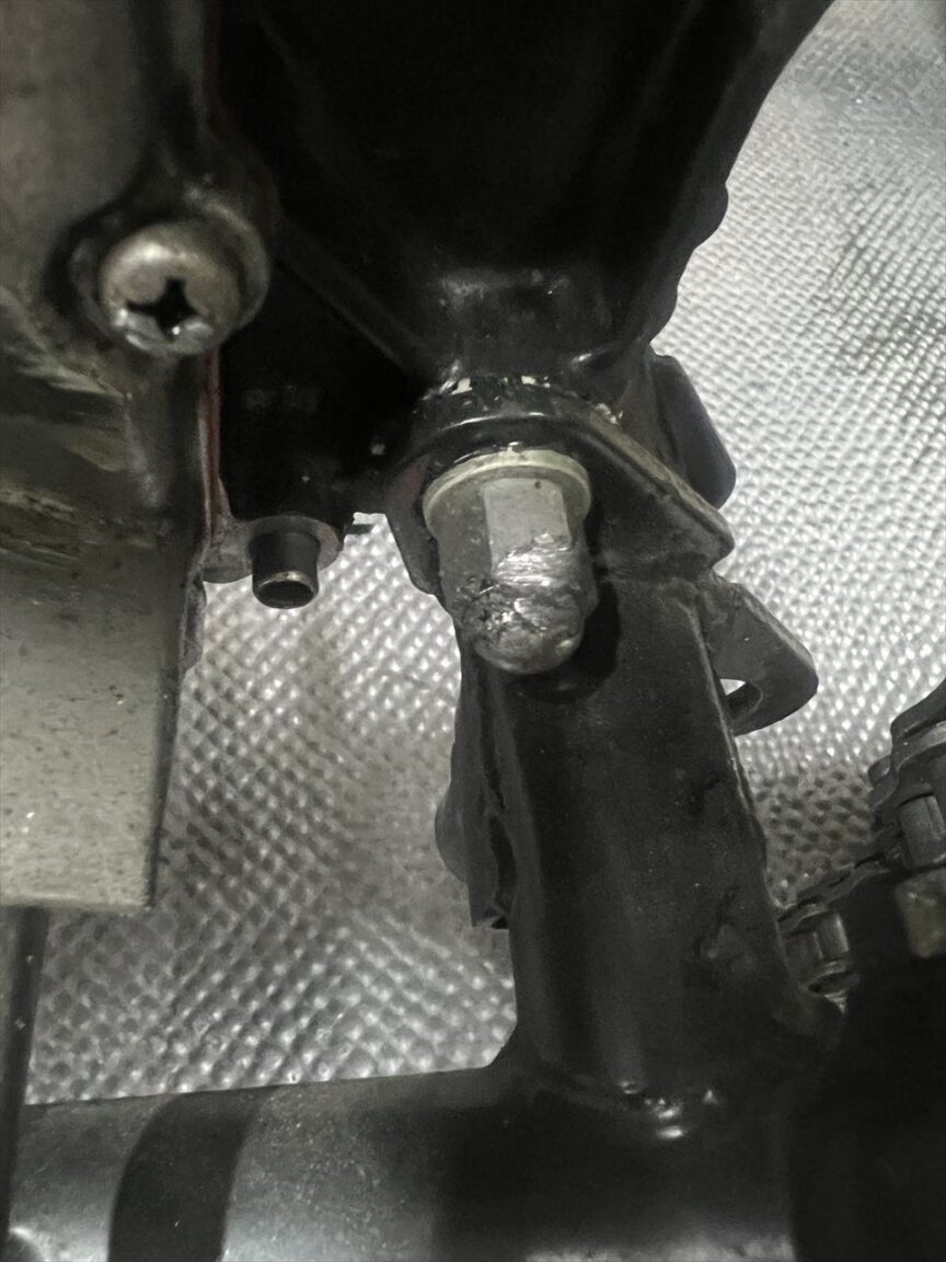 こちらのマフラーステー、斜めの状態で接続されていて回転する構造なので、マフラーの重量はほとんど受け持っていません。その場合エキゾーストスタッドのみでマフラーの全重量を支えることになり負担がかかるので、改善しないといけませんね。
