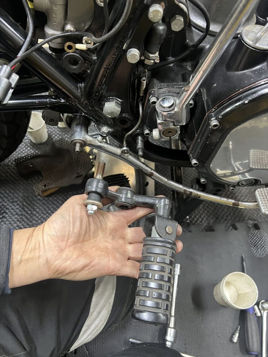 エンジン下ろしに邪魔になる、右のステップとブレーキペダルも外します。