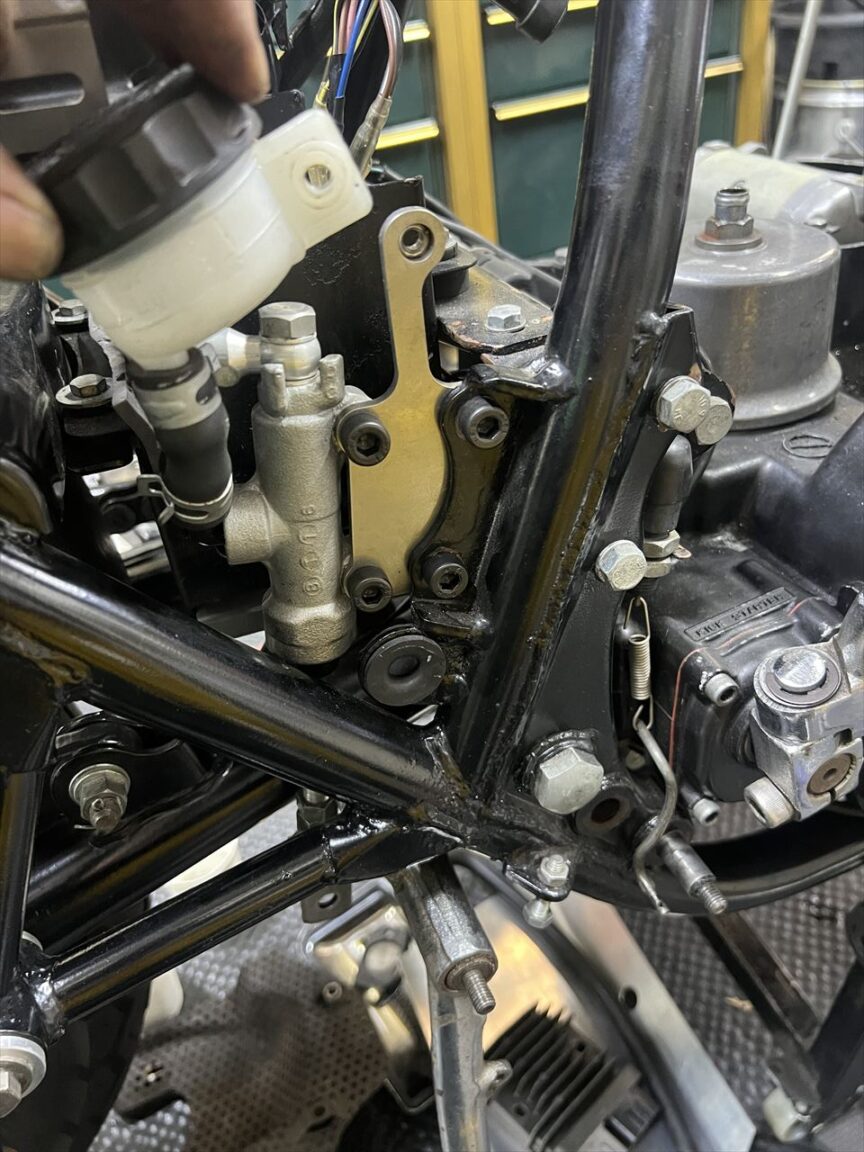 ペダル軸の奥にあったスペーサーも取り除きます。Mk2系はブレーキペダルが数種類ありますが、マスターやフレームの構造も同じだけ種類があり、組み合わせに互換性が無いので注意が必要です。
