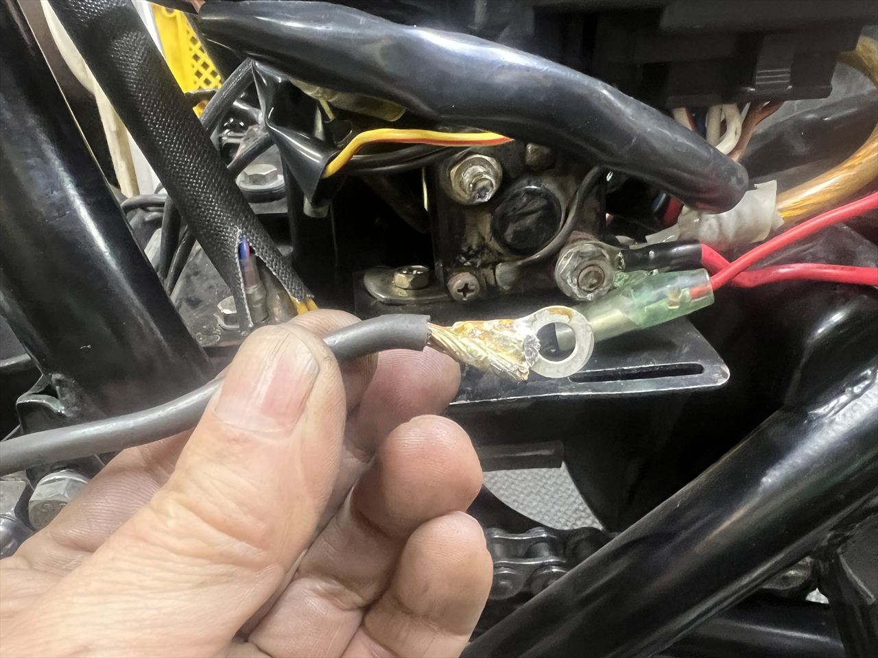 ケーブルはモーター側で継いであるようで、ターミナルのカバーは無くなっています。ケーブルは作り直したほうがいいでしょう。