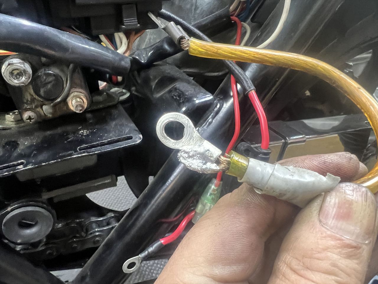 バッテリー側のケーブル端子も、同様にハンダ付けでした。かなり不安な感じに付いています。ここも改善しましょう。