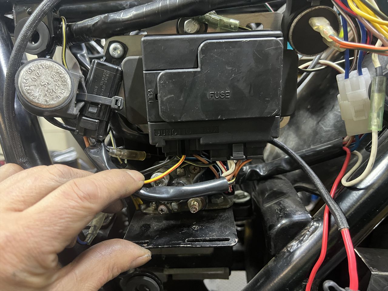 社外ヒューズBOXの下に出てる配線も、マグネットスイッチに干渉してかなり窮屈な状態です。どちらかを移設した方が良さそうです。