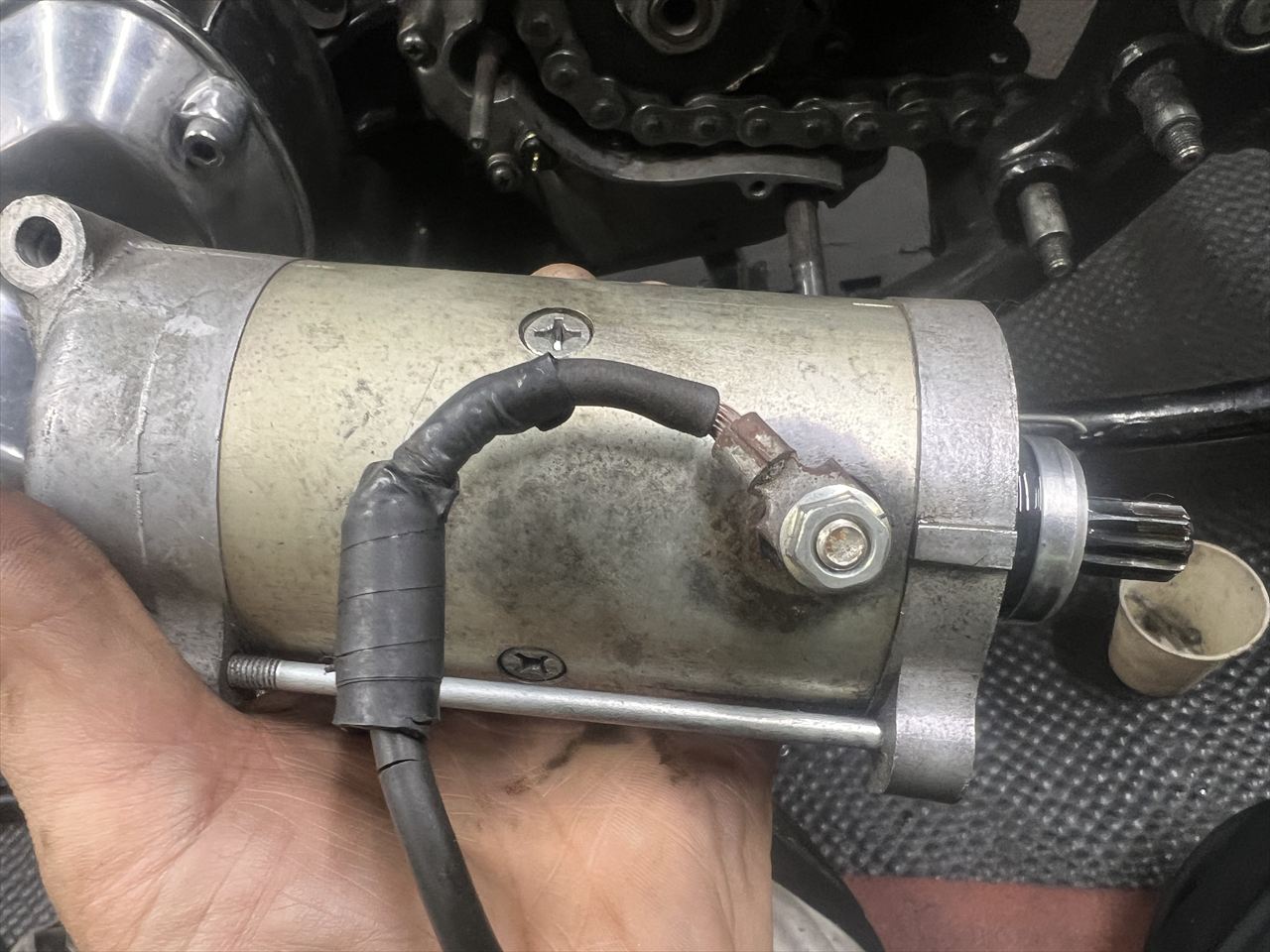 スターターモーターも外します。マグネットスイッチ側の端子は、ハンダのみで取り付けられています。少々心もとないのでこれも改善した方がいいでしょう。