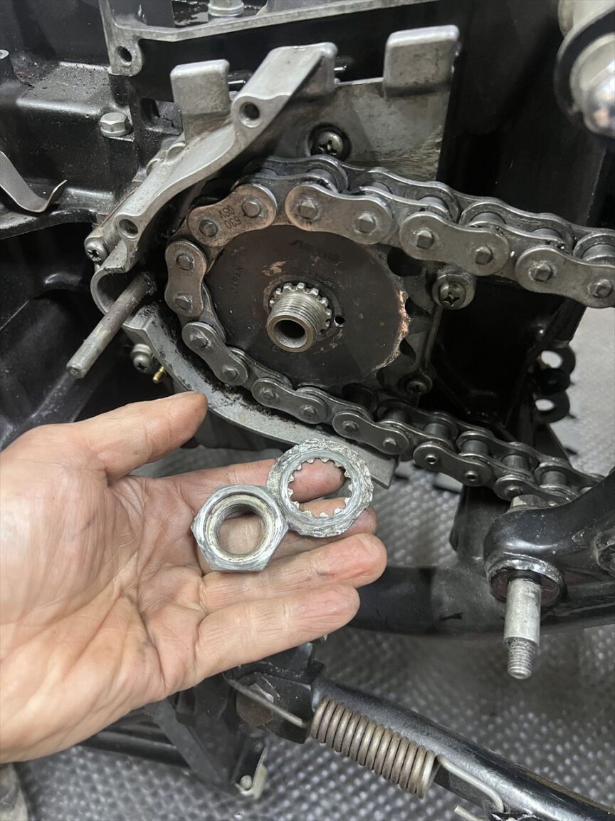 チェーンを外すのでフロントスプロケを外します。ロックワッシャーはかなり年期が入っているので交換しておきます。チェーンは630ですね。