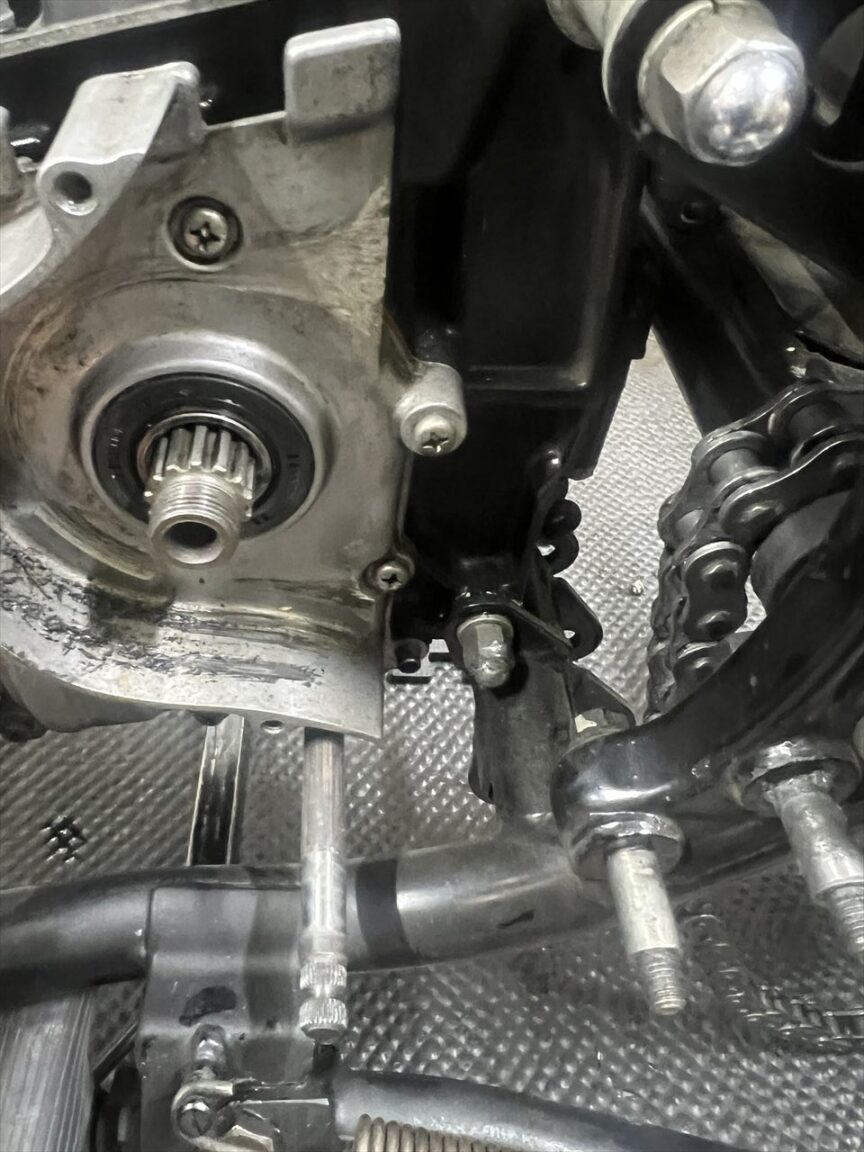 エンジンマウントボルトのナットが、長い袋ナットになっており、チェーンの干渉でかなり削れています。ここは出っ張らせてはいけない場所です。ここも要改善。ミッションカバーにもチェーンで削れた痕があります。チェーンとスプロケはこの際530にしてはいかがでしょうか。
