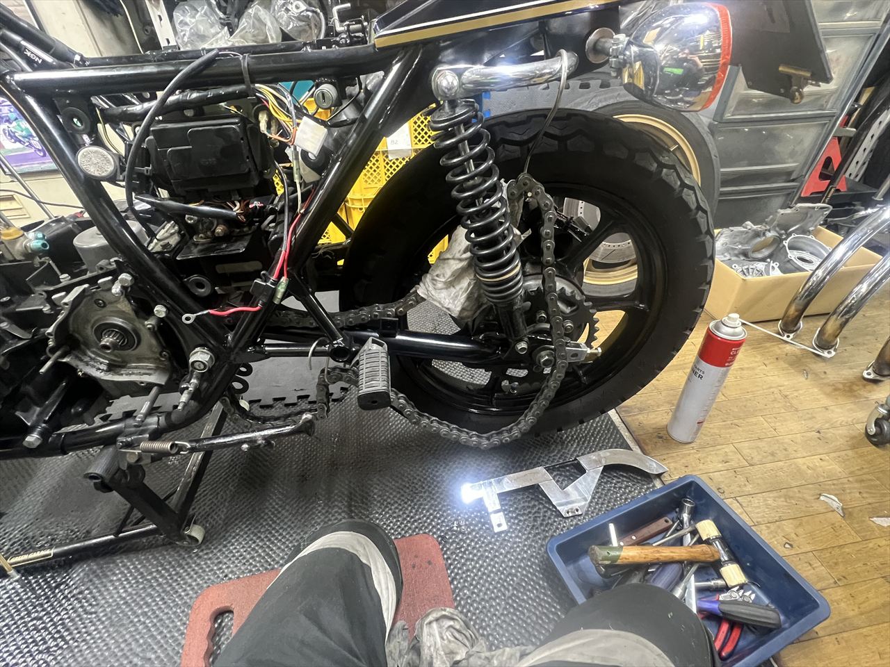 エンジンを下ろしても転がせるように、チェーンはリヤスプロケからも外して吊るしておきます。