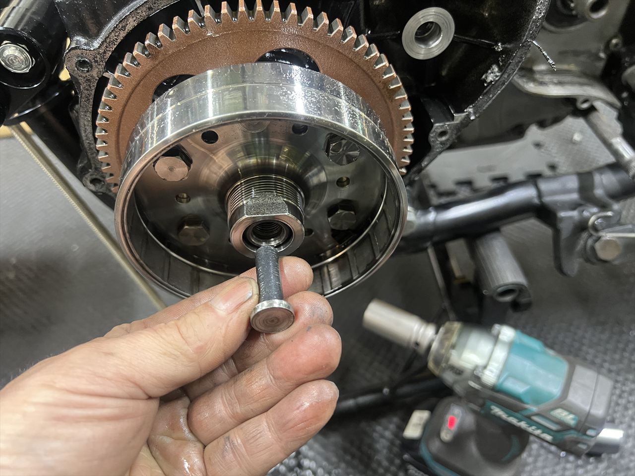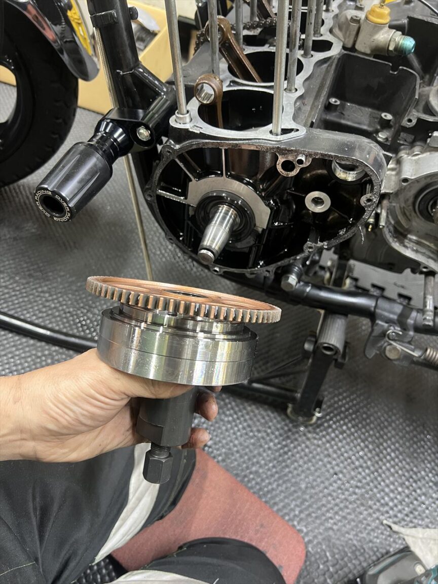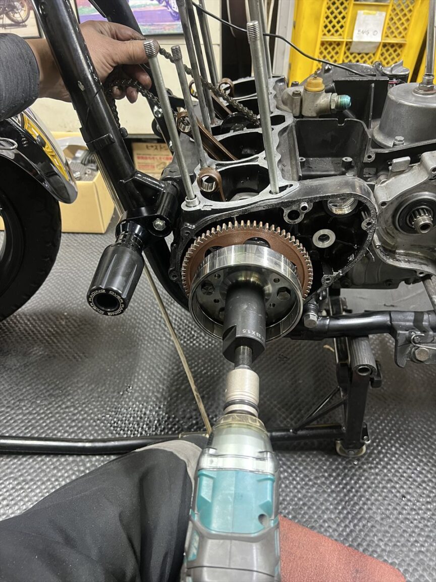 プーラーはこのジェネレーターローターに適合する、M33×1.5の汎用SSTを使います。腰上を分解したこの状態でインパクトを使うときは、カムチェーンがクランク周りに噛み込まないよう持ち上げてながら行います。