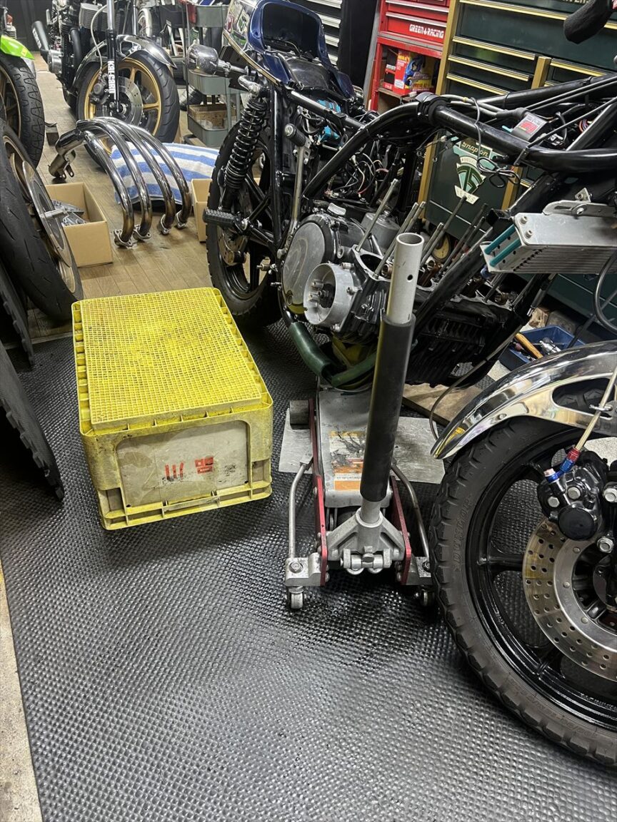 エンジンマウントボルトを外し、ジャッキでエンジンを持ち上げ、フレームには養生をしてからエンジンを下ろします。