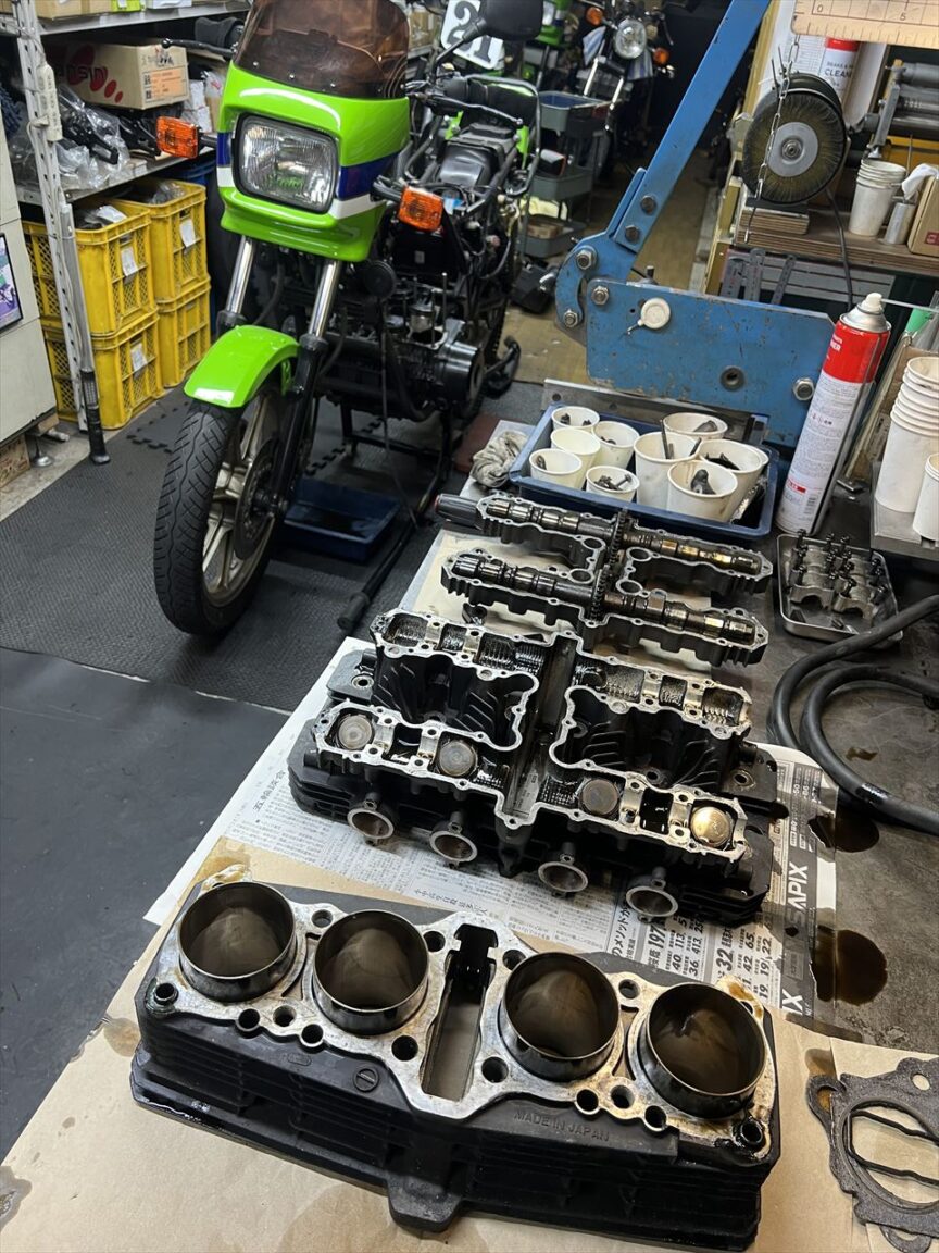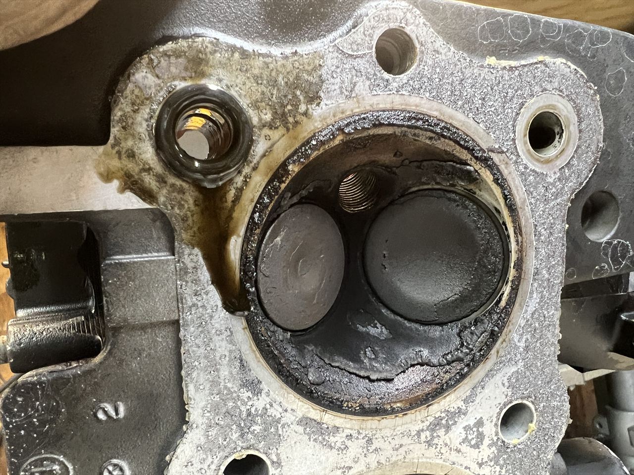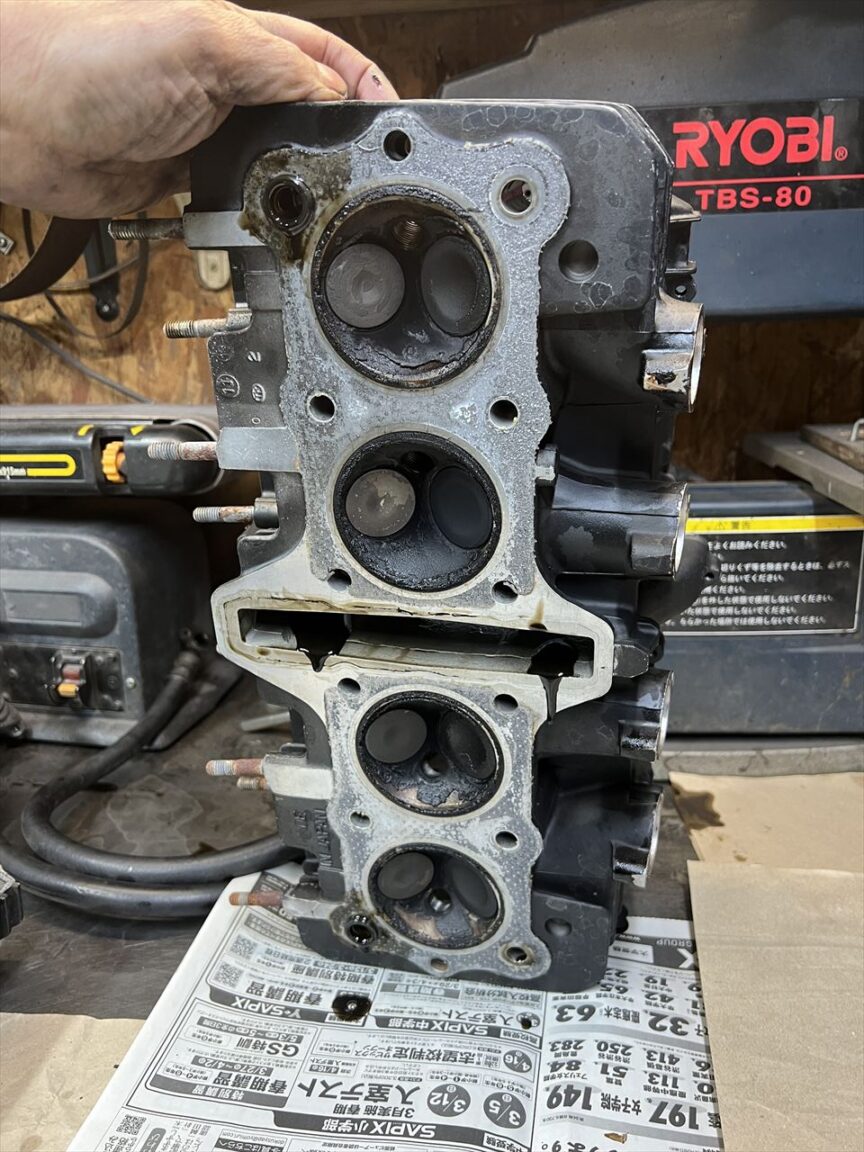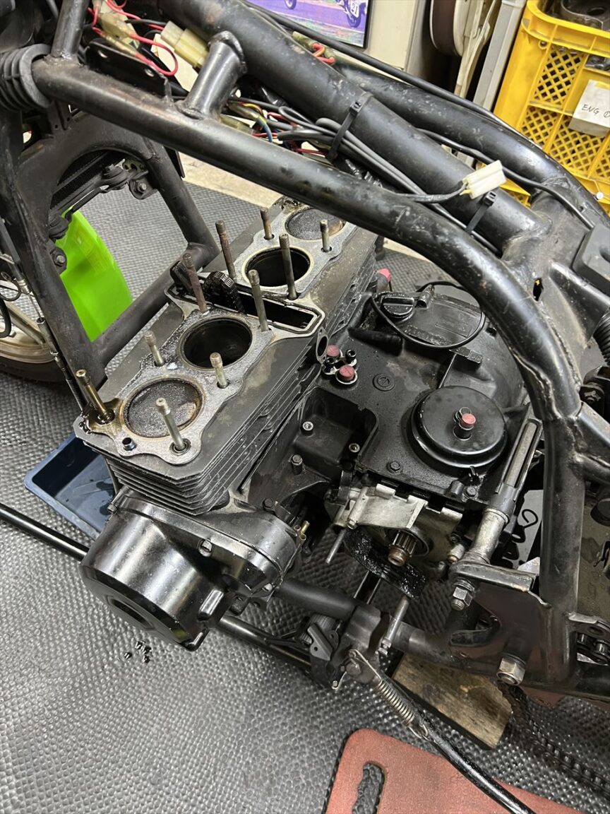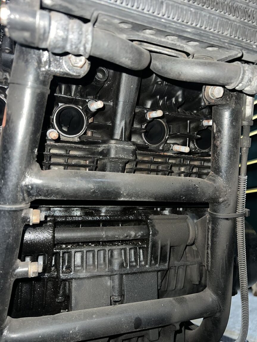 キャブとエアクリボックスを外します。こちらもシリンダーベース周りが特に濡れています。インテークポートは軽く研磨されていますね。
