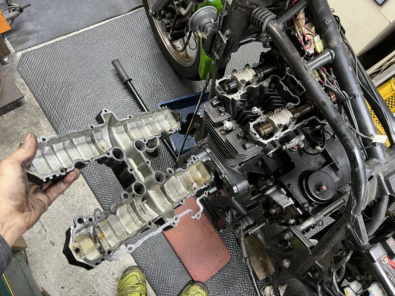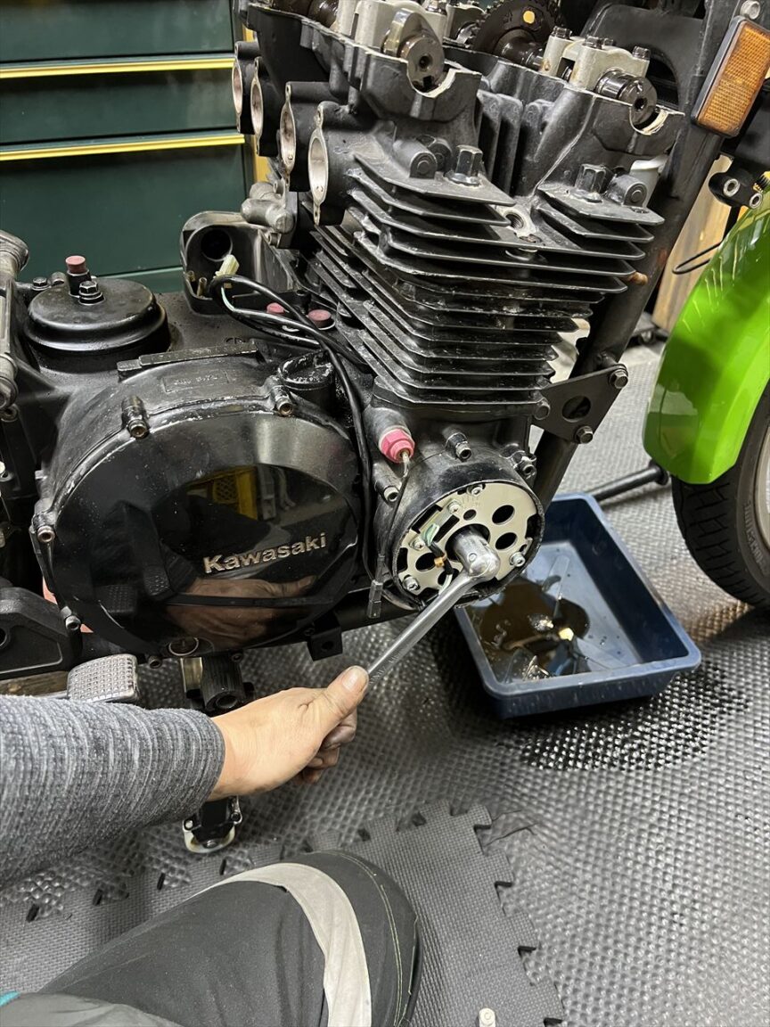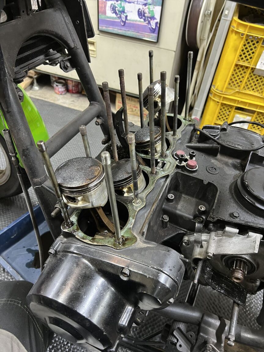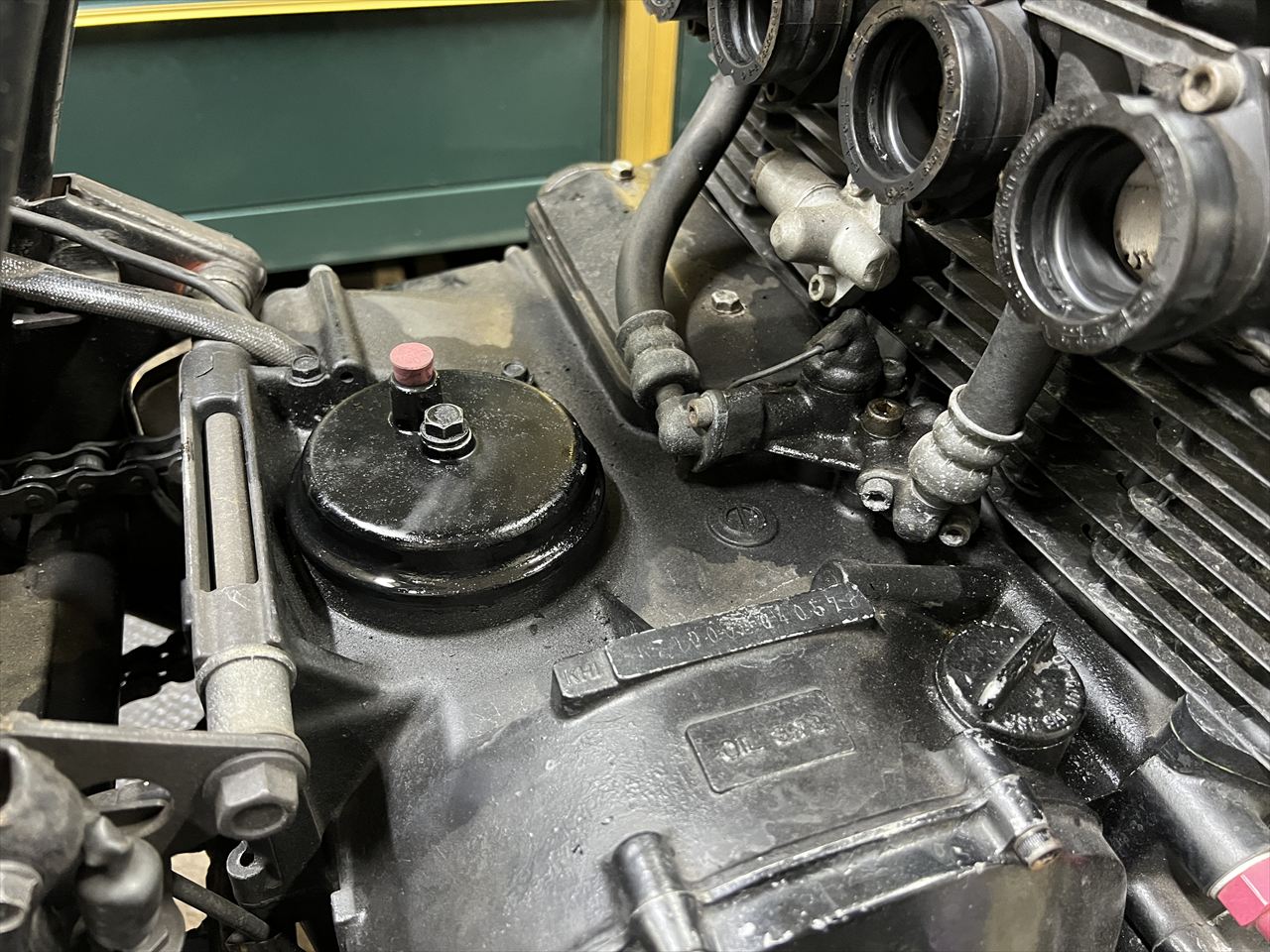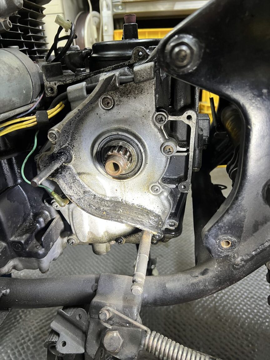 作業待ちの間も乗っていただいていたため、オイル漏れは進行しているようです。酷く湿っているのはシリンダーベースより下の部分。応急処置の液体ガスケット盛りも効果なかったようで、ぐるっと一周漏れ出しているようです。