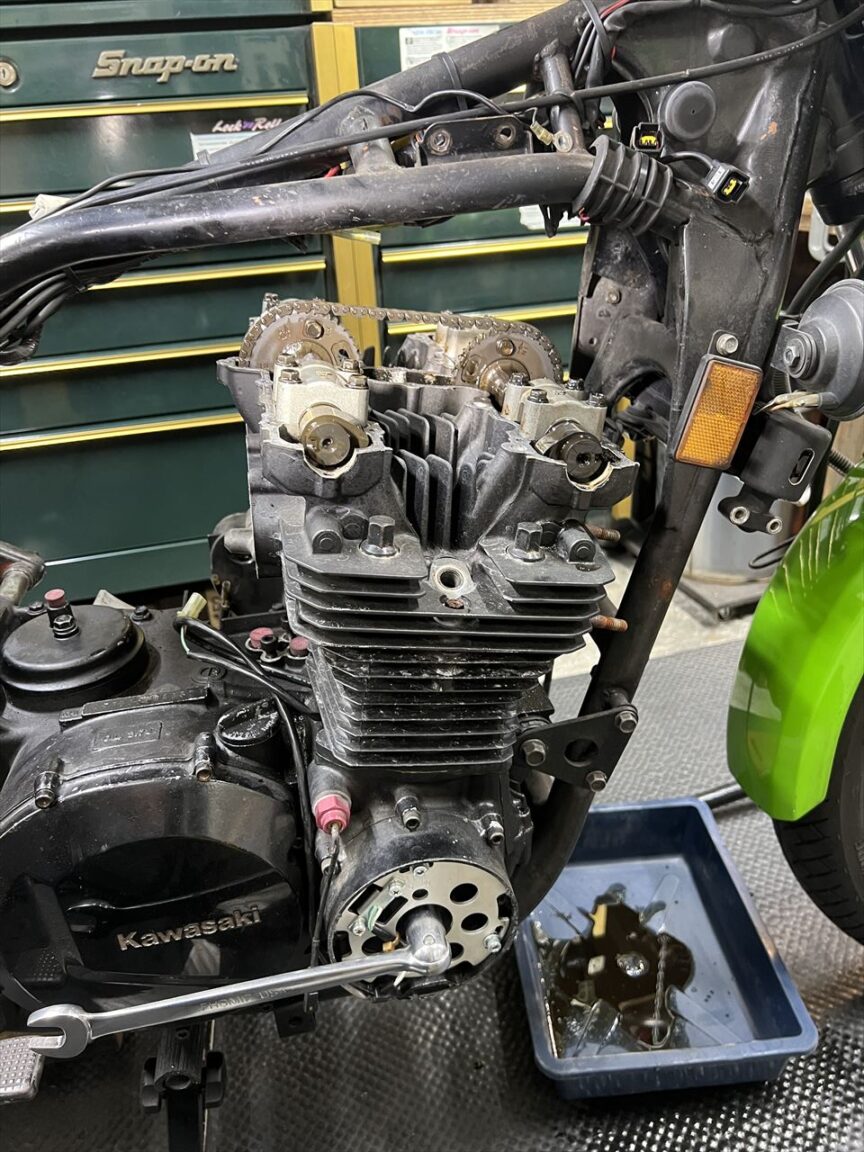プラグを外してからレンチでクランクを正転逆転します。バックラッシュが大きいので、カムチェーンテンショナーの戻りが多いようです。
