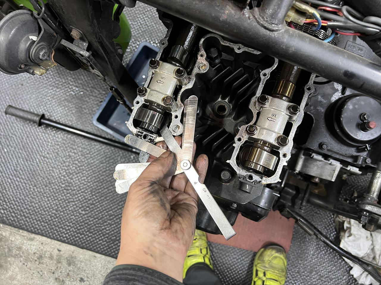 バルブクリアランスを計測します。限度値より広いところ、狭いところ、いろいろあります。